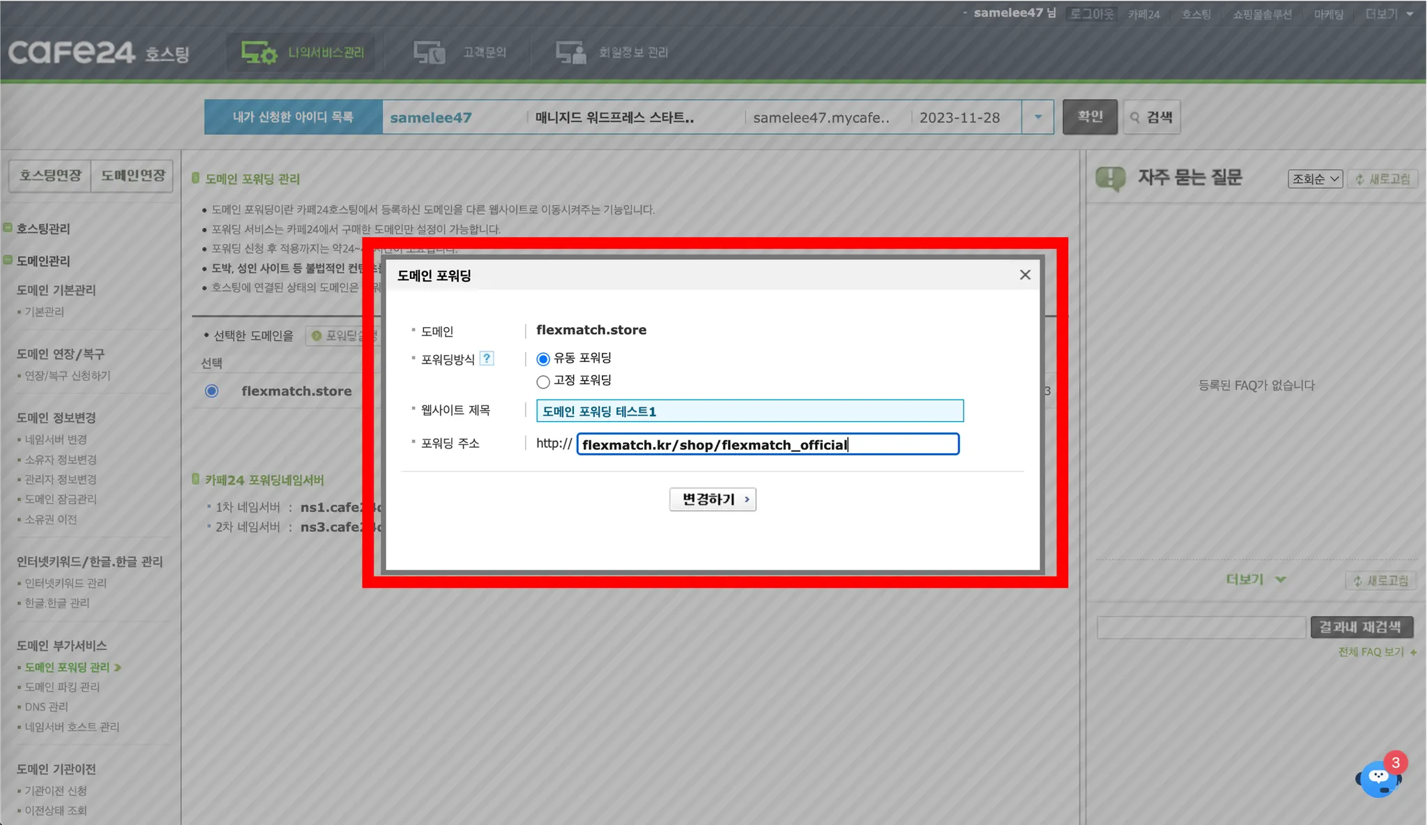 유동 포워딩 클릭 후 웹사이트 제목(본인 설정), 포워딩 주소(본인 스토어 주소) 입력 후 변경하기 클릭