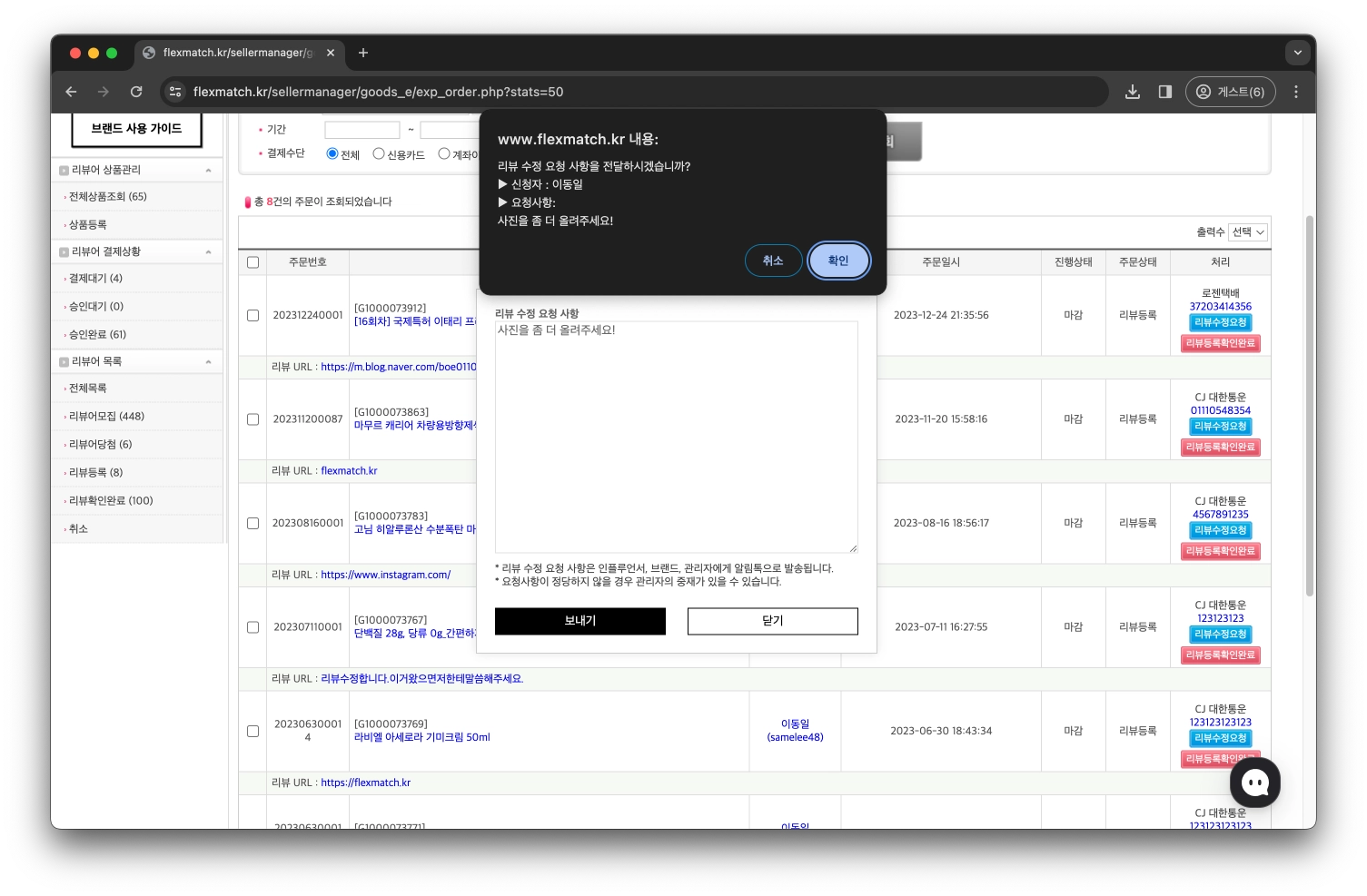 리뷰 수정 요청 사항 팝업이 열리며, 수정 요청 사항을 입력할 수 있습니다.