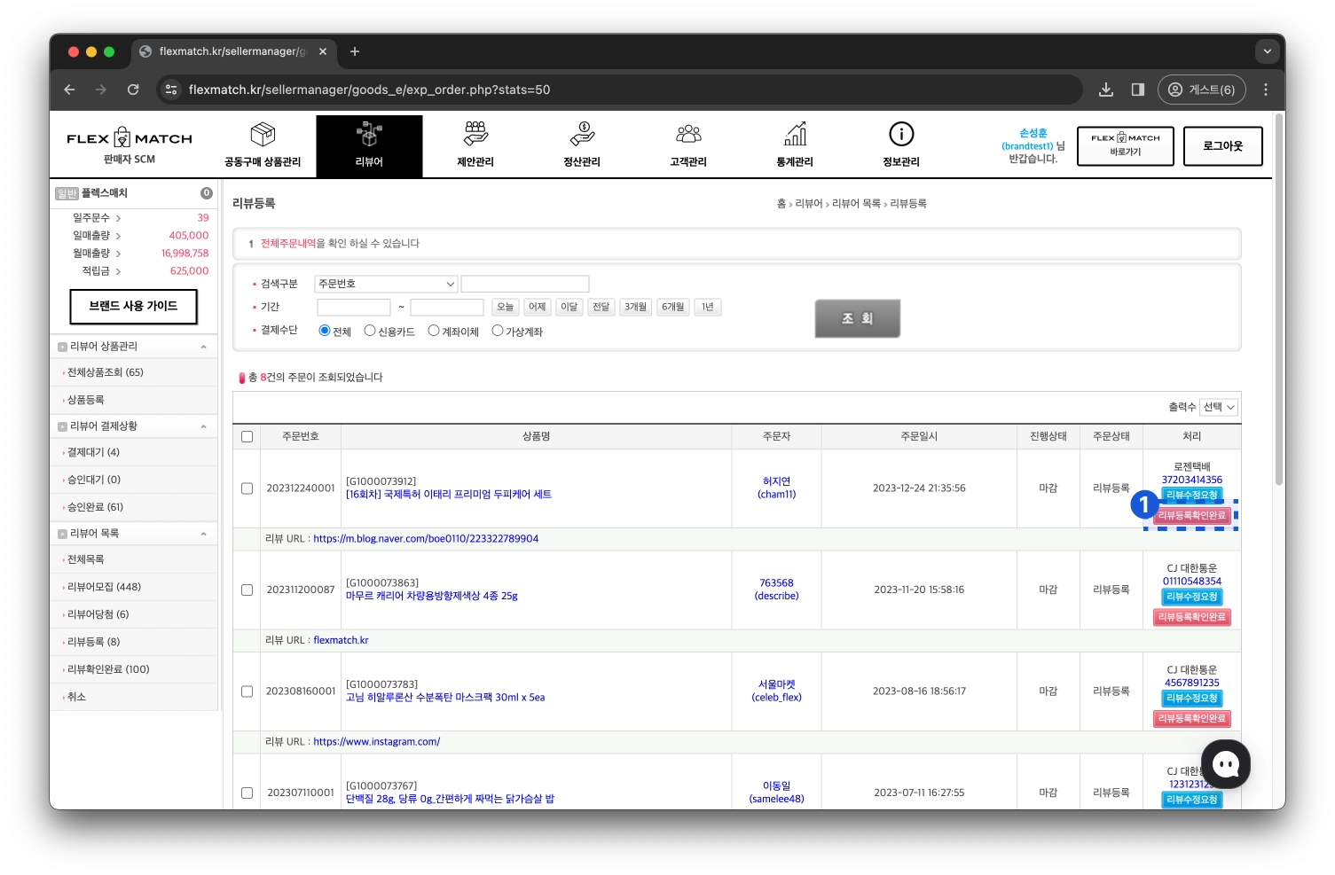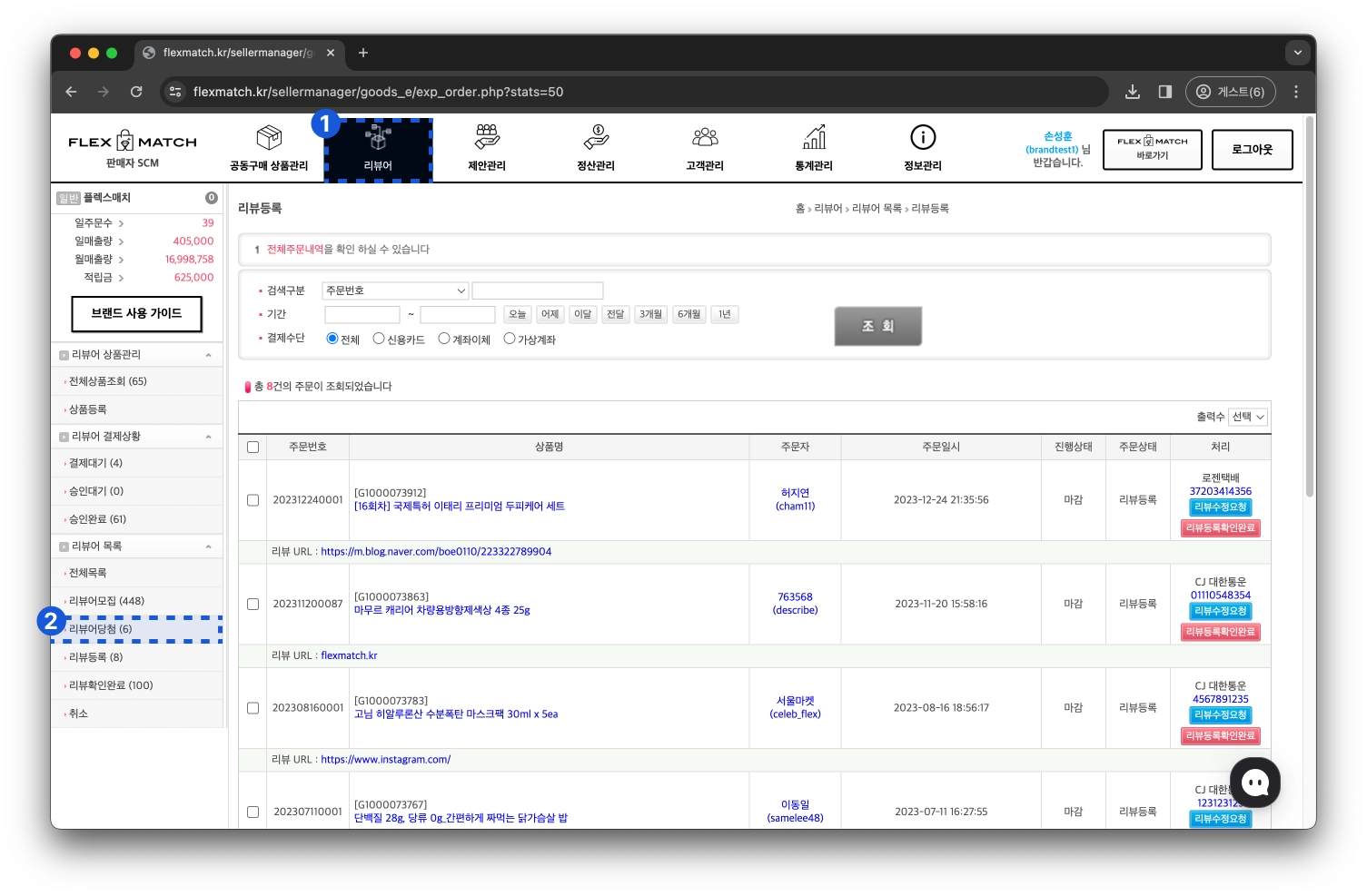 좌측 메뉴에서 “리뷰등록” 클릭