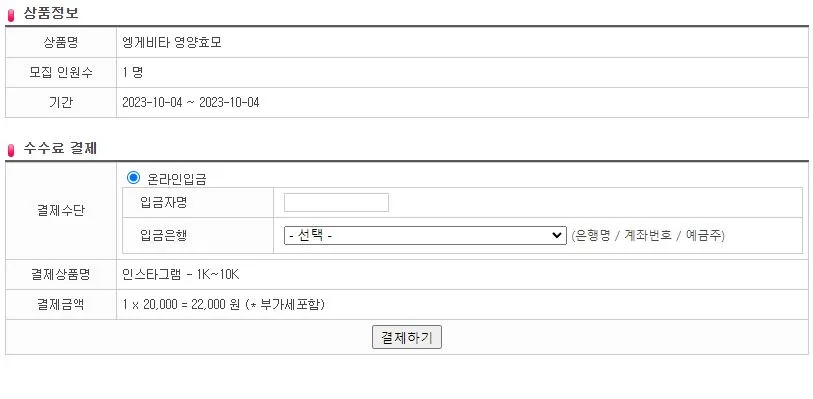[입금자명]을 입력하고, [입금은행]을 선택하고, 결제 상품과 결제금액을 확인하고 [결제하기] 버튼을 클릭하면, 승인대기로 넘어갑니다.다.