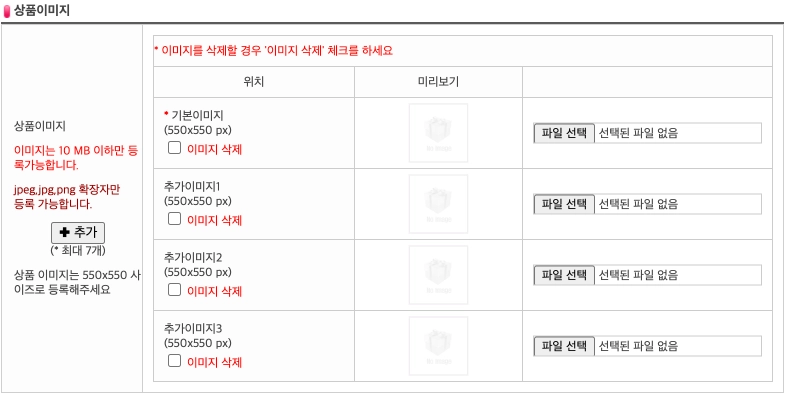 상품 대표이미지(썸네일)와 추가 이미지를 업로드합니다.