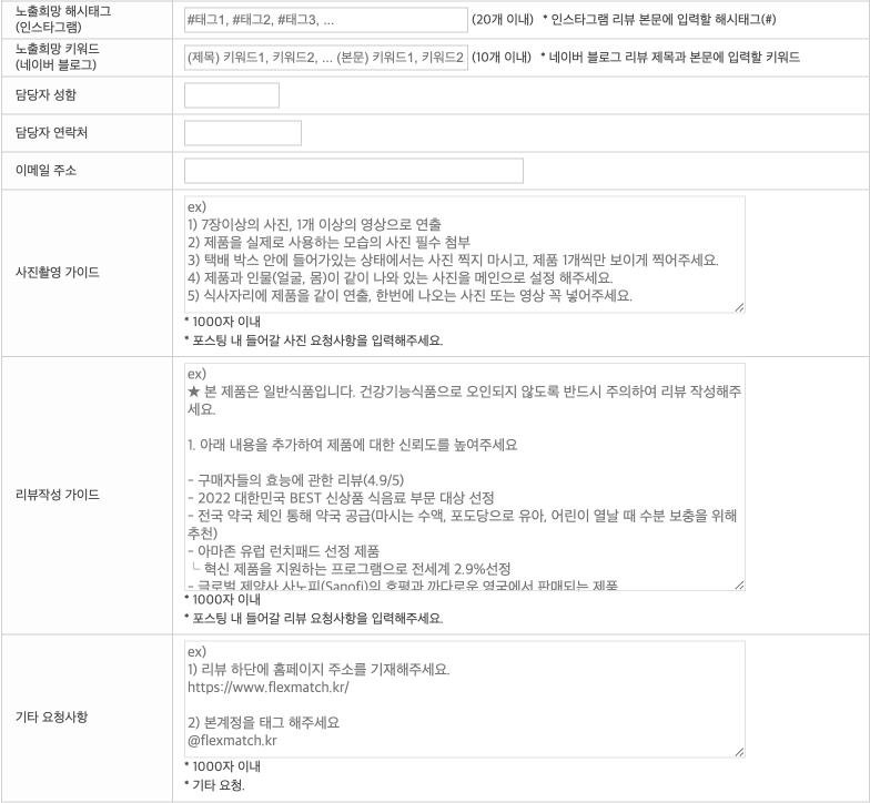 * 가이드를 구체적으로 작성할 수록 리뷰어들이 사진 또는 영상을 촬영할 때, 수월 할 수 있기 때문에 자세히 작성하는 것이 좋다.