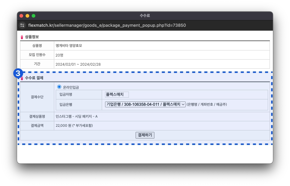 이후 플렉스매치 계좌로 무통장입금을 하시면 됩니다.