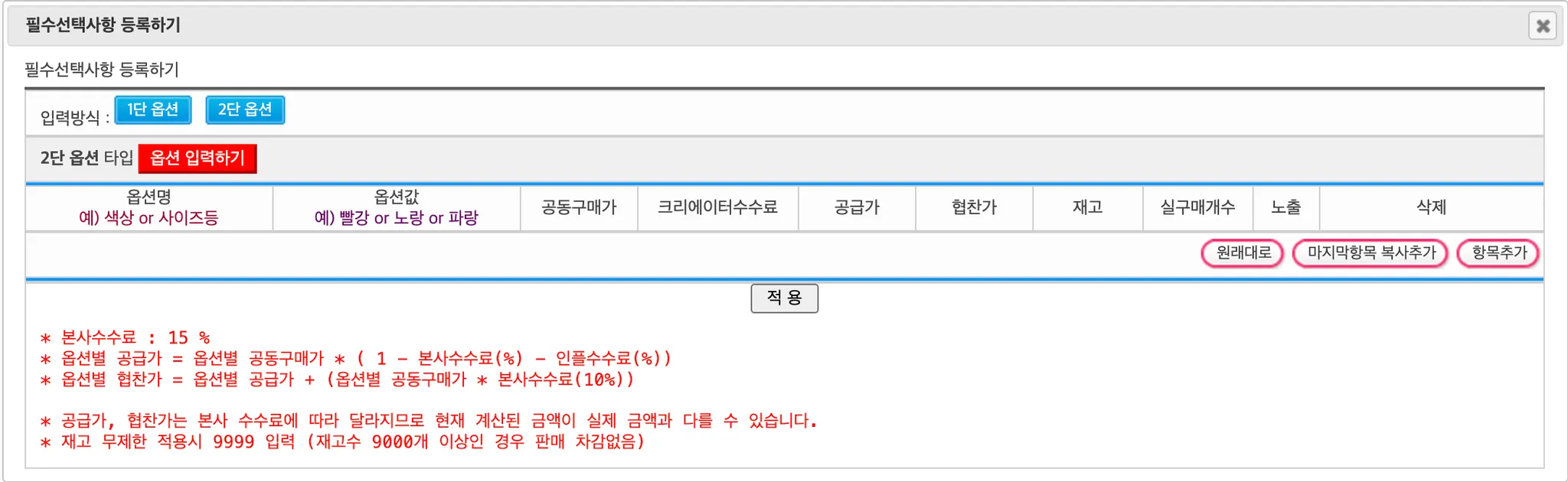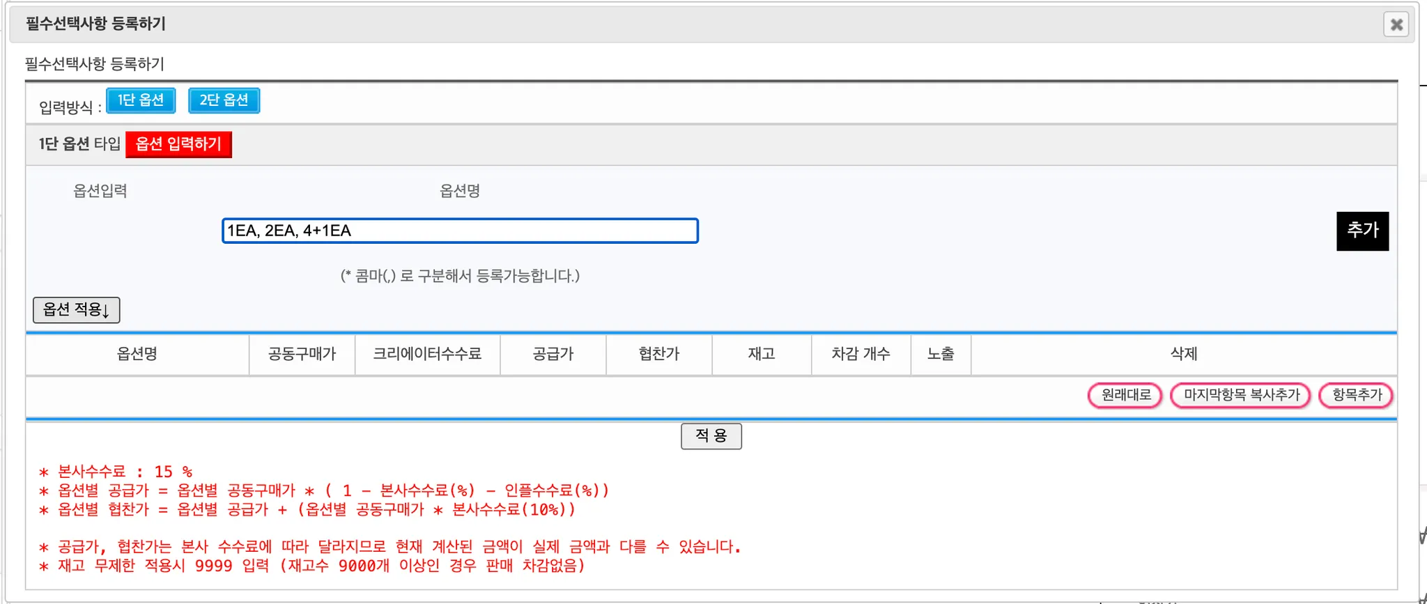 공급가 | 옵션별 공급가 |