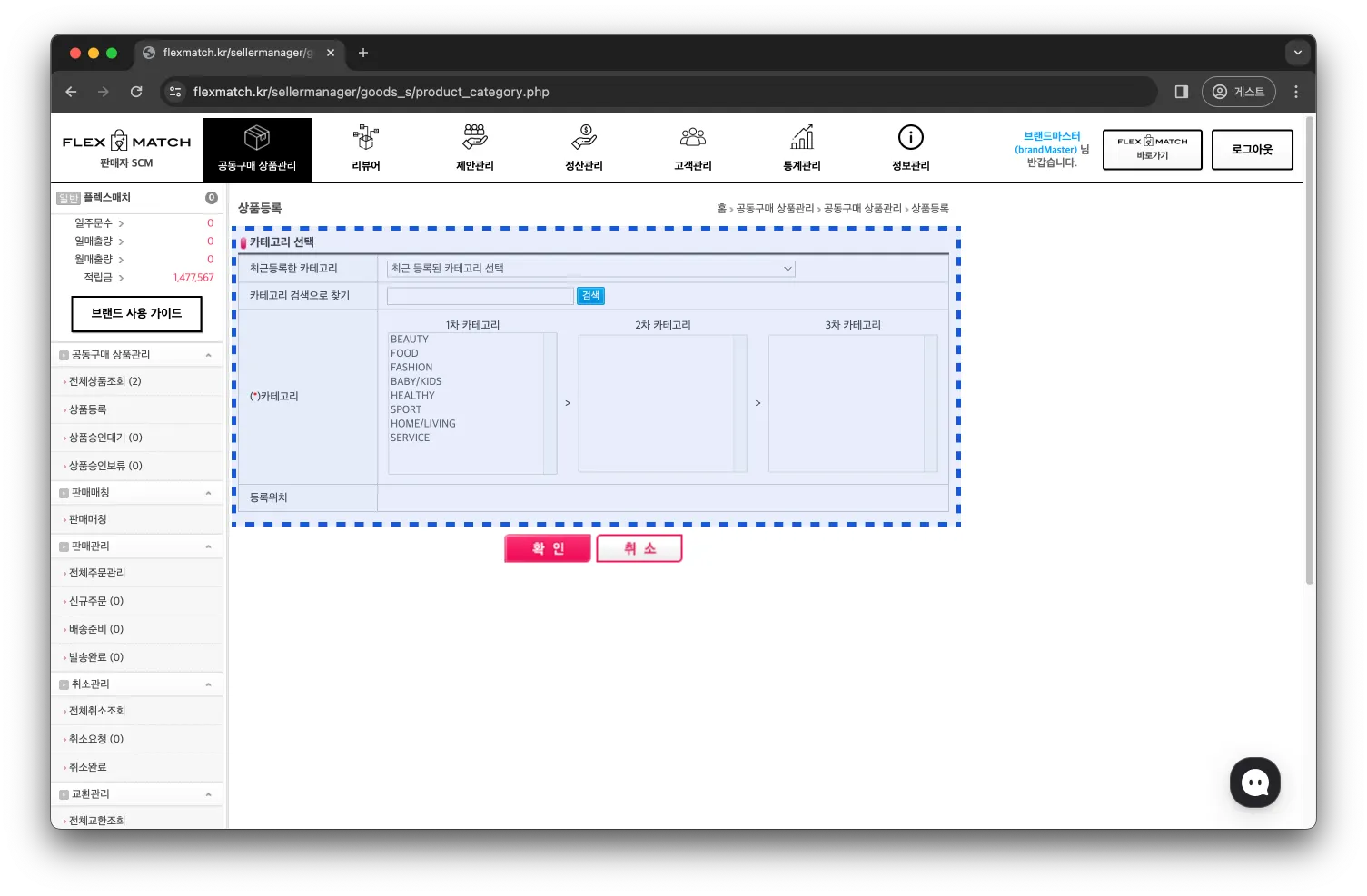 카테고리는 1차 > 2차 > 3차 순서대로 선택하며, 3차 카테고리가 없을 경우 선택하지 않아도 됩니다.