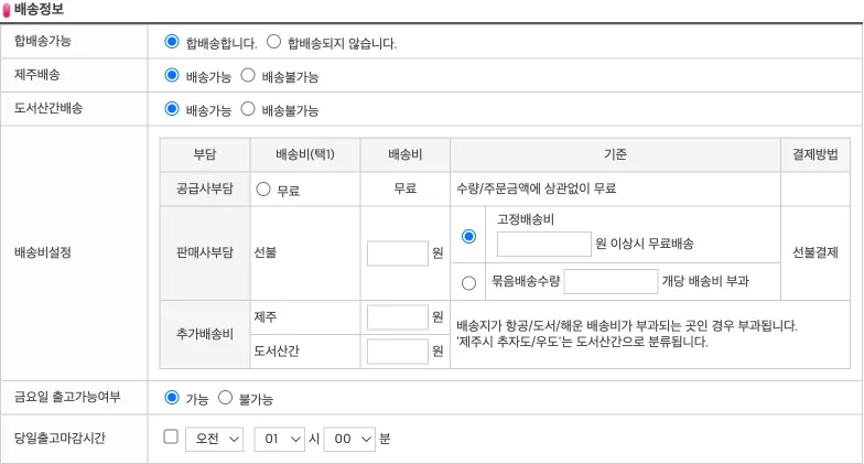기본 배송비 | 해당 상품의 기본 배송비이며, 입력시 하단에 있는 [배송정보]에 같이 자동으로 입력된다. |