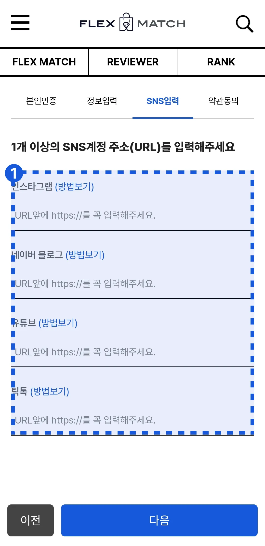플렉스매치의 크리에이터로 가입하기 위해서는 1개 이상의 SNS 주소를 꼭! 입력해야해요