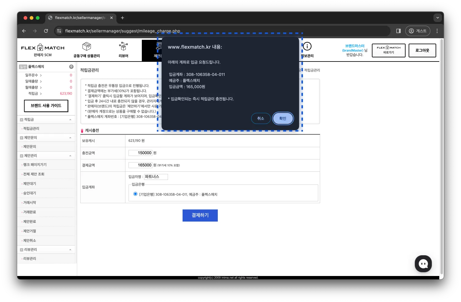 플렉스매치 계좌로 결제금액을 입금합니다.