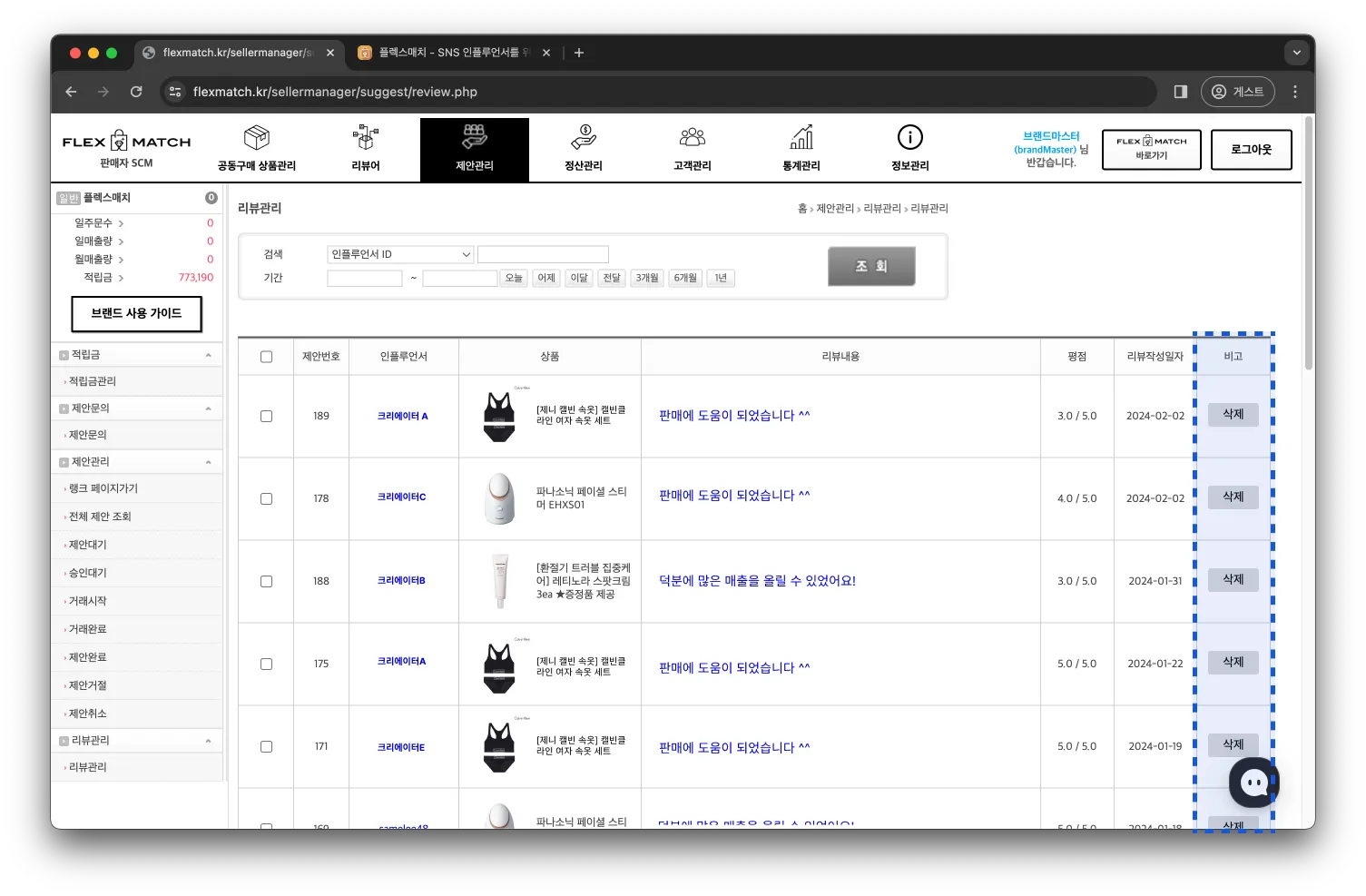 비고란에 “삭제”를 클릭하면, 작성했던 리뷰를 삭제할 수 있습니다.