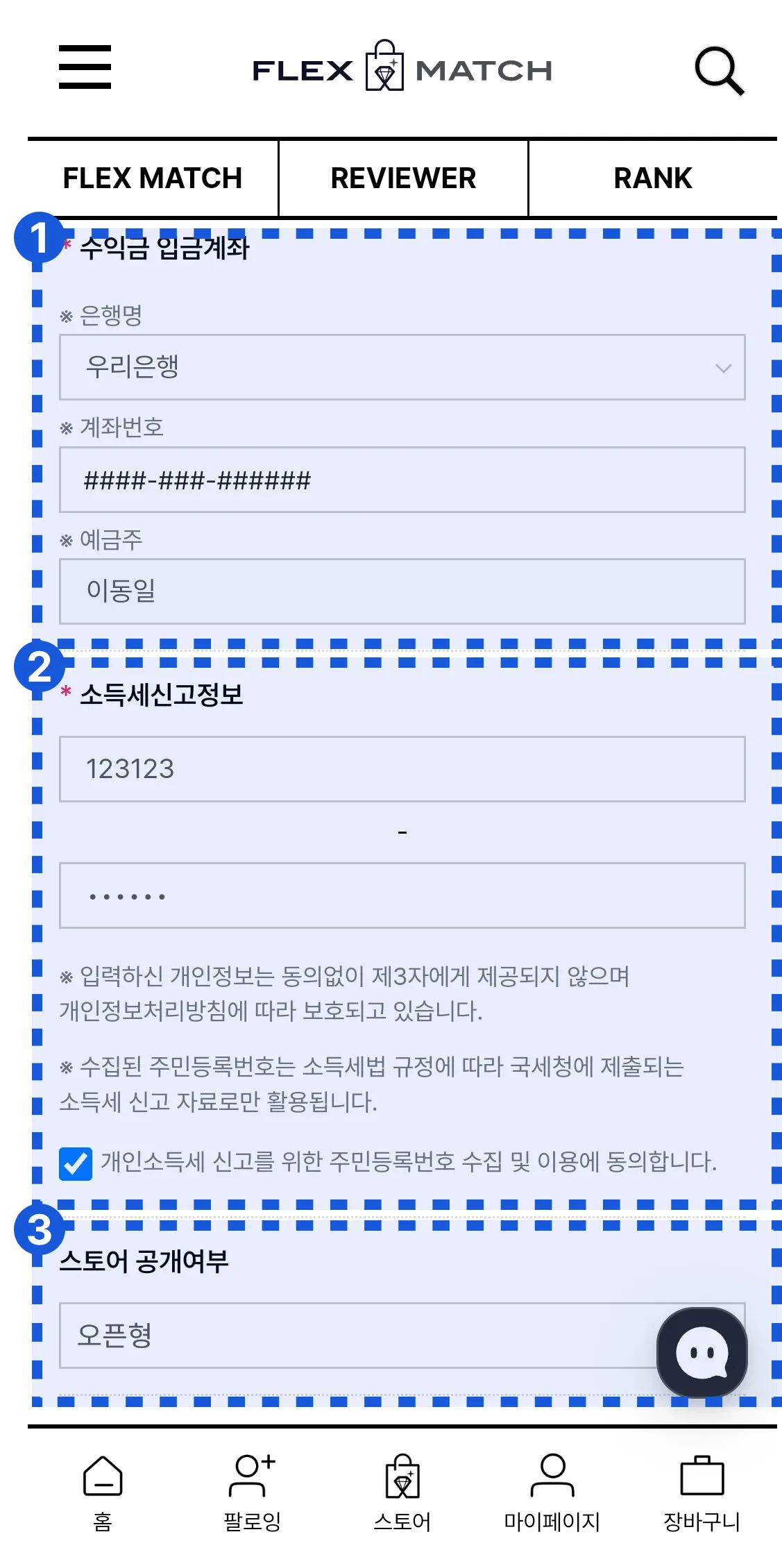 소득세신고정보는 정산금액을 신고하기 위해 필요한 정보이며, 주민등록번호를 꼭 입력해야하고, 수집 동의를 하셔야 스토어를 이용하실 수 있습니다