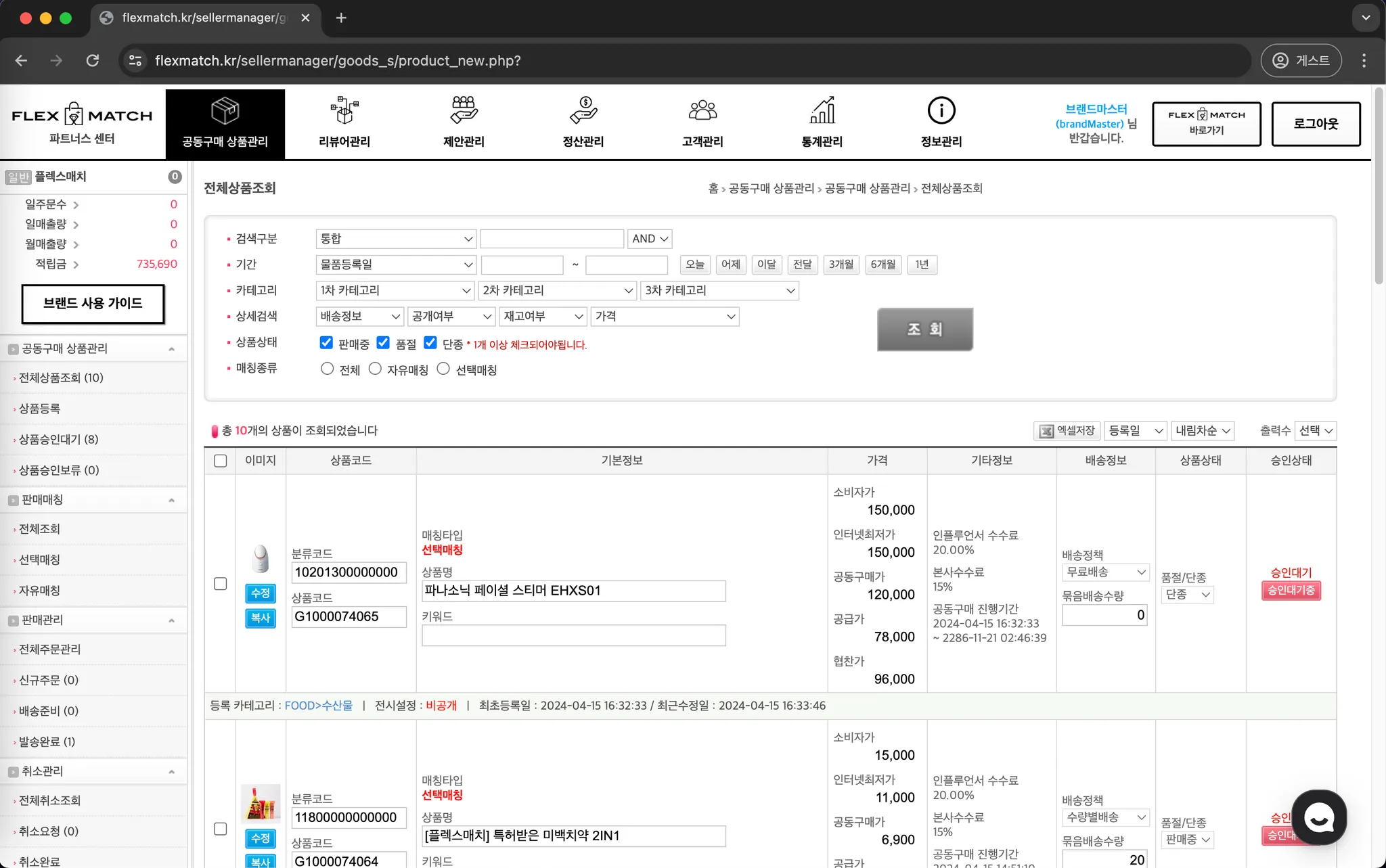 “승인완료”, “승인대기”, “승인보류” 상품들을 모두 볼 수가 있으며, 상품을 수정 및 복사할 수 잇씁니다.