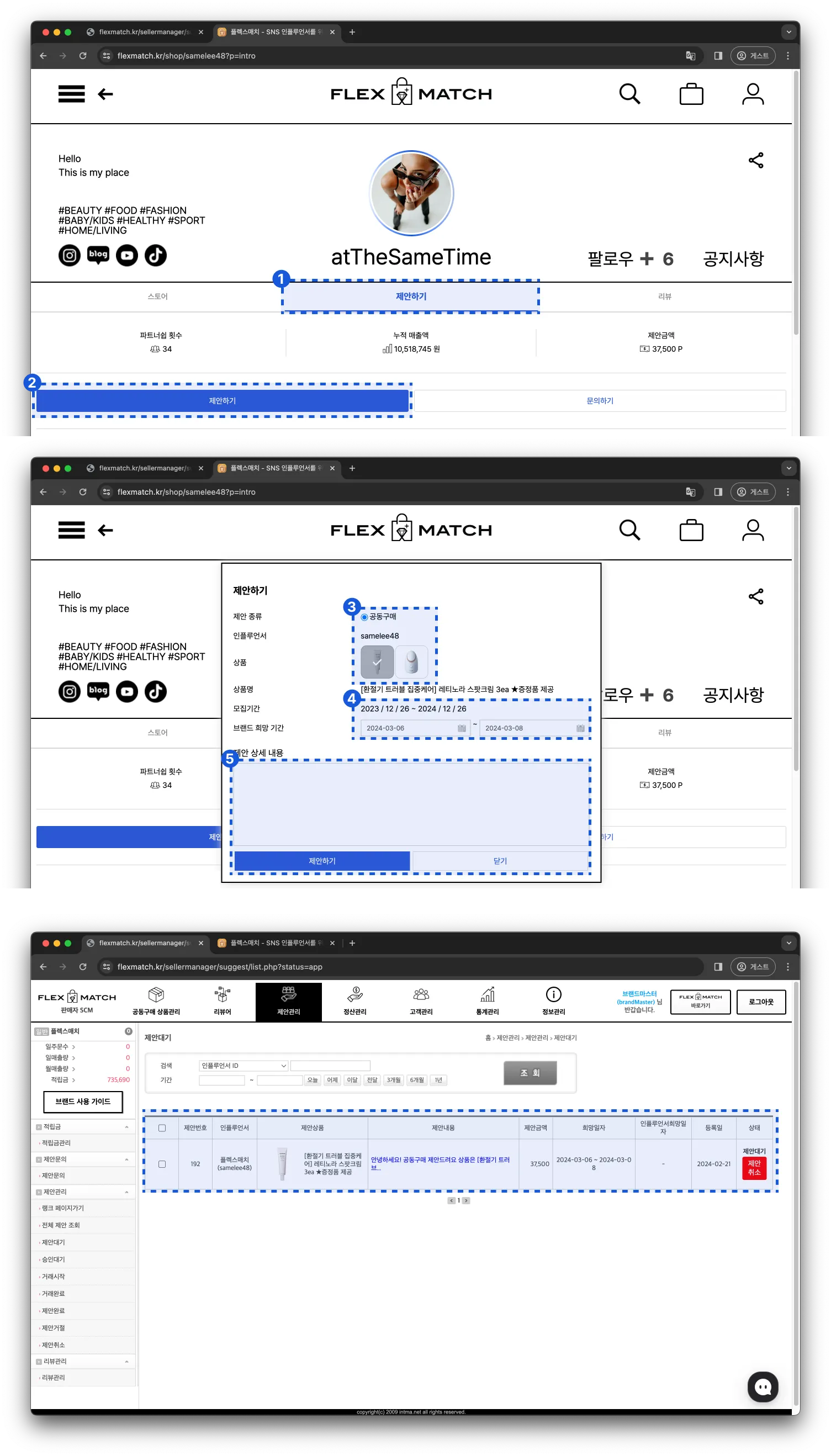 플렉스 파트너스가 크리에이터 회원에게 일정금액을 지불하고 공동구매를 “제안”하는 기능입니다.
