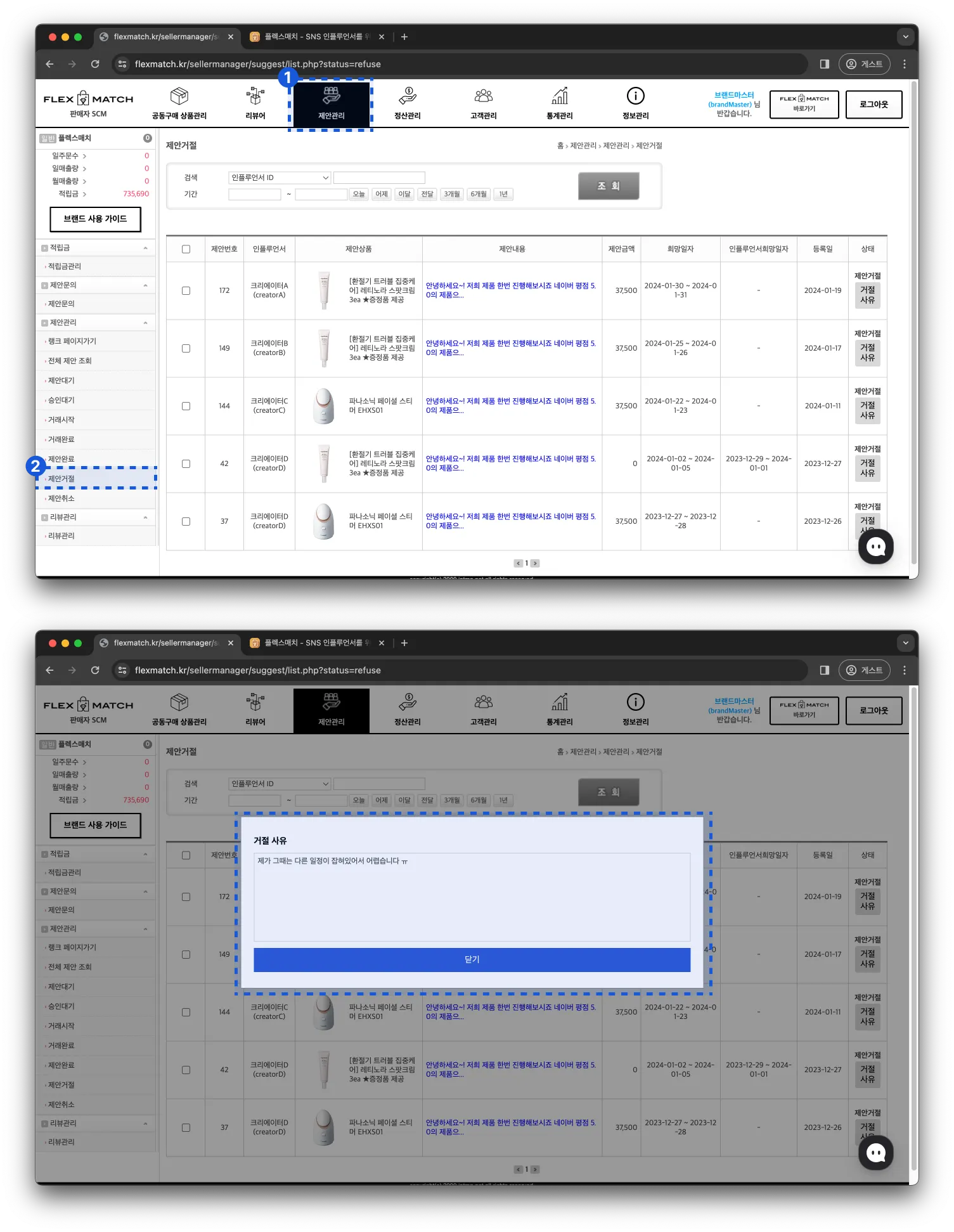 크리에이터는 제안거절시 “거절사유”를 입력하여야 하며, 파트너스는 거절 사유를 확인할 수 있습니다.