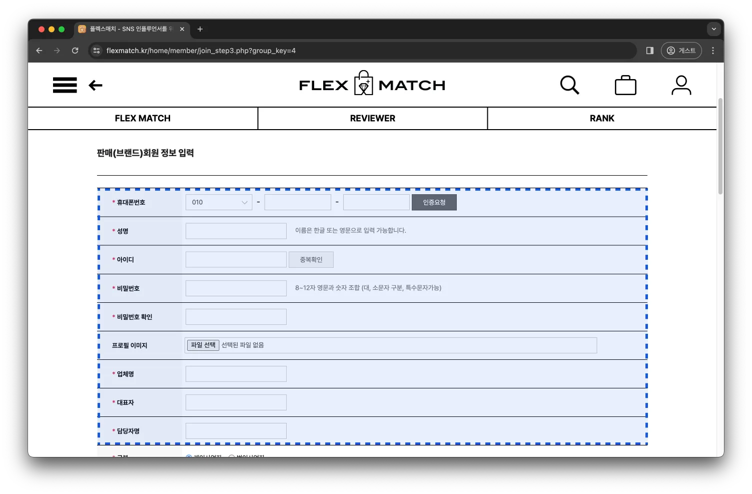 성명 | 가입하는 회원이 이름을 작성합니다.(브랜드는 회사명을 작성해도 됩니다) |