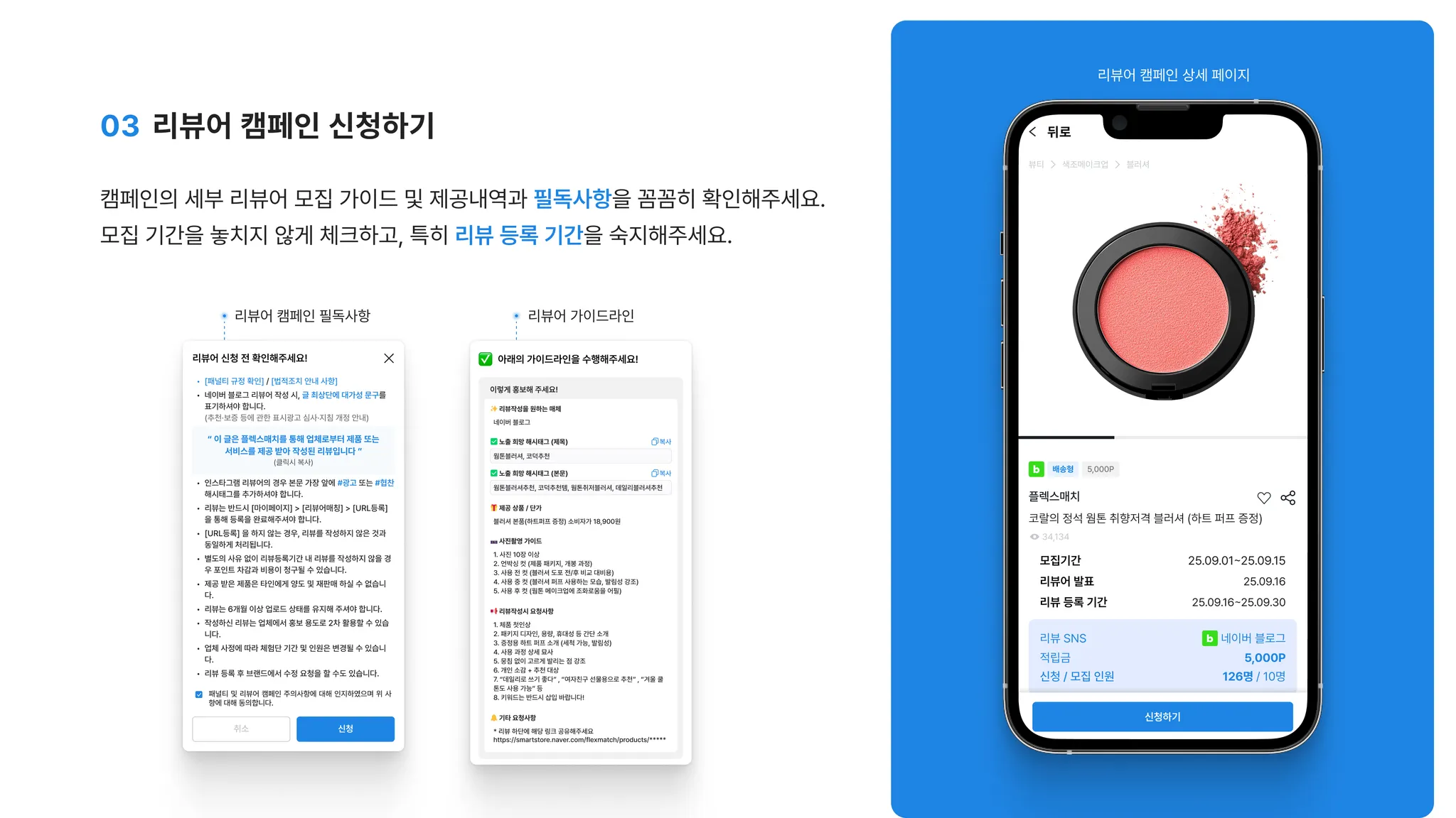 당첨되신 리뷰어 캠페인의 상세 페이지에 있는 가이드라인을 꼭 지켜서 작성해 주세요.