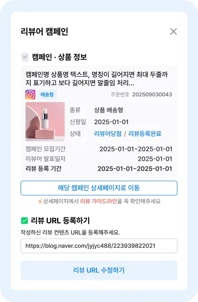 이 기간 안에 SNS에 업로드한 콘텐츠의 리뷰 URL을 복사해 팝업의 URL 등록란에 붙여 넣은 뒤 저장해주세요.