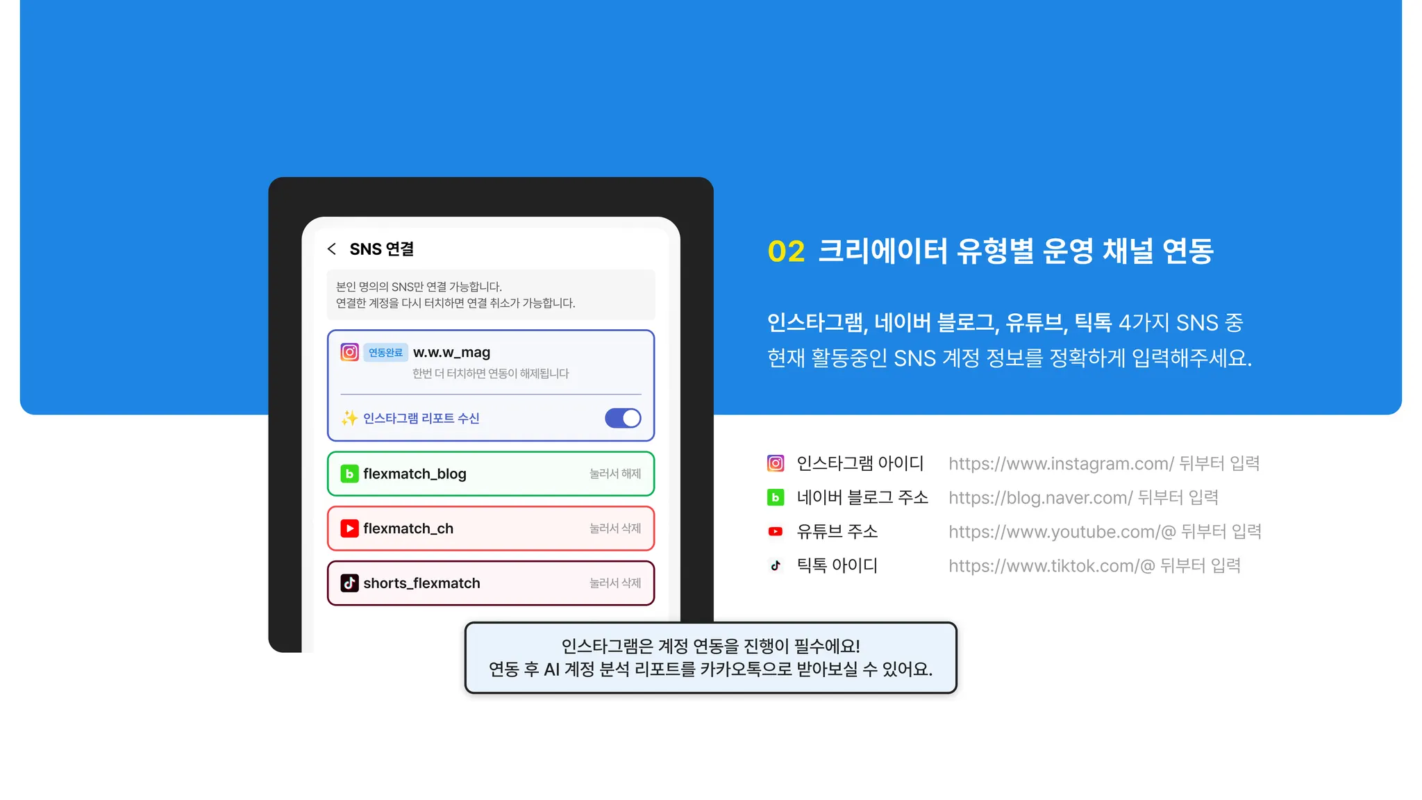 네이버 블로그, 유튜브, 틱톡 계정의 경우 별도의 연동 단계 없이 계정 아이디만 입력 후 저장해 주세요.