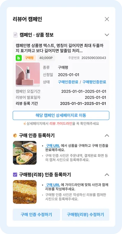 구매한 플랫폼에 해당 상품에 대한 리뷰를 작성 완료했다는 구매평(리뷰) 인증을 순서대로 진행해 주셔야 해요.