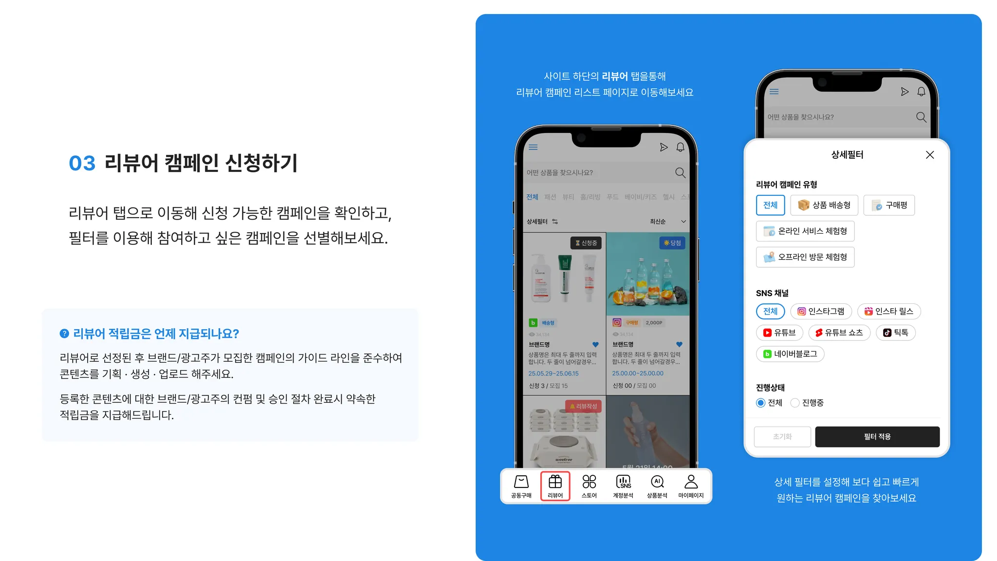 리뷰 콘텐츠 작성 시에는 브랜드에서 제공하는 해당 캠페인의 가이드라인을 지켜 주셔야 해요.