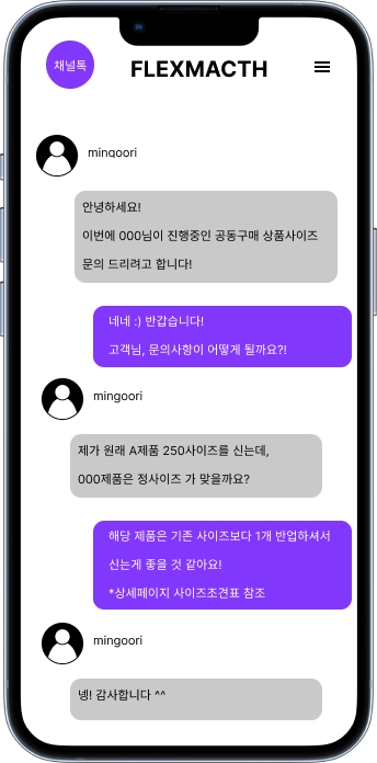 플렉스매치의 크리에이터 회원님이 상품을 판매하다보면, 팔로워분들은 상품이나 크리에이터님에게 직접 문의를 하는 경우가 있어요!