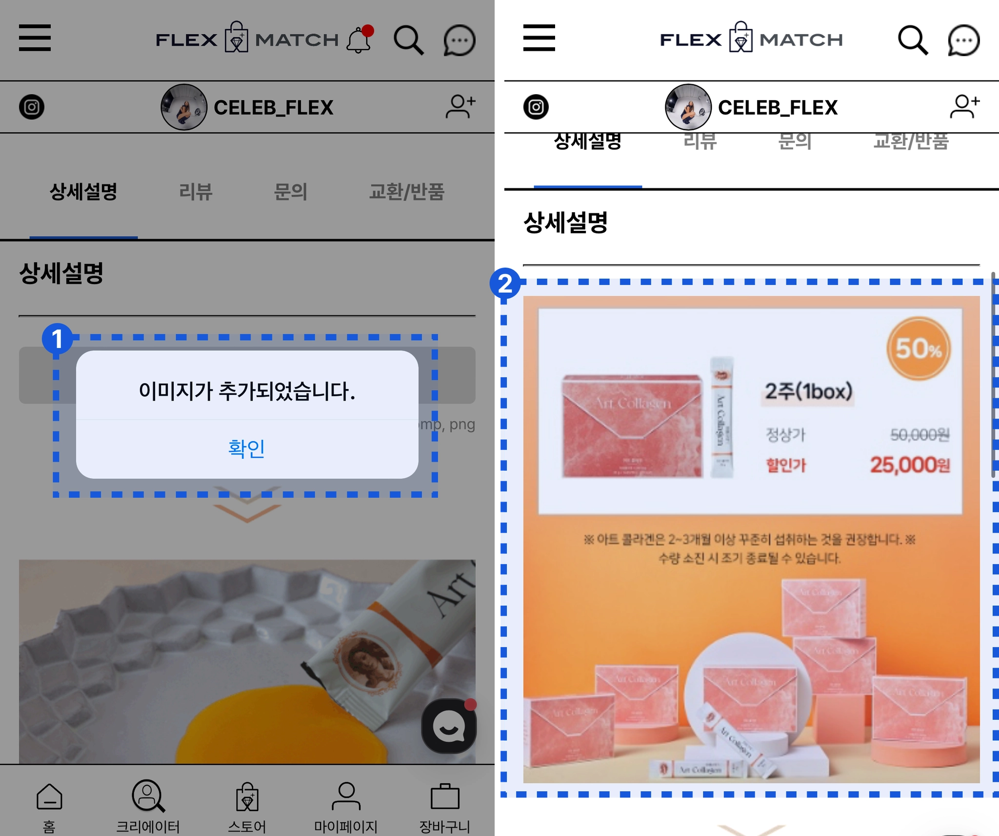 매칭이 된 뒤에 스토어에서 기본 상품 상세페이지 위에 본인만의 이미지를 추가할 수 있어요!