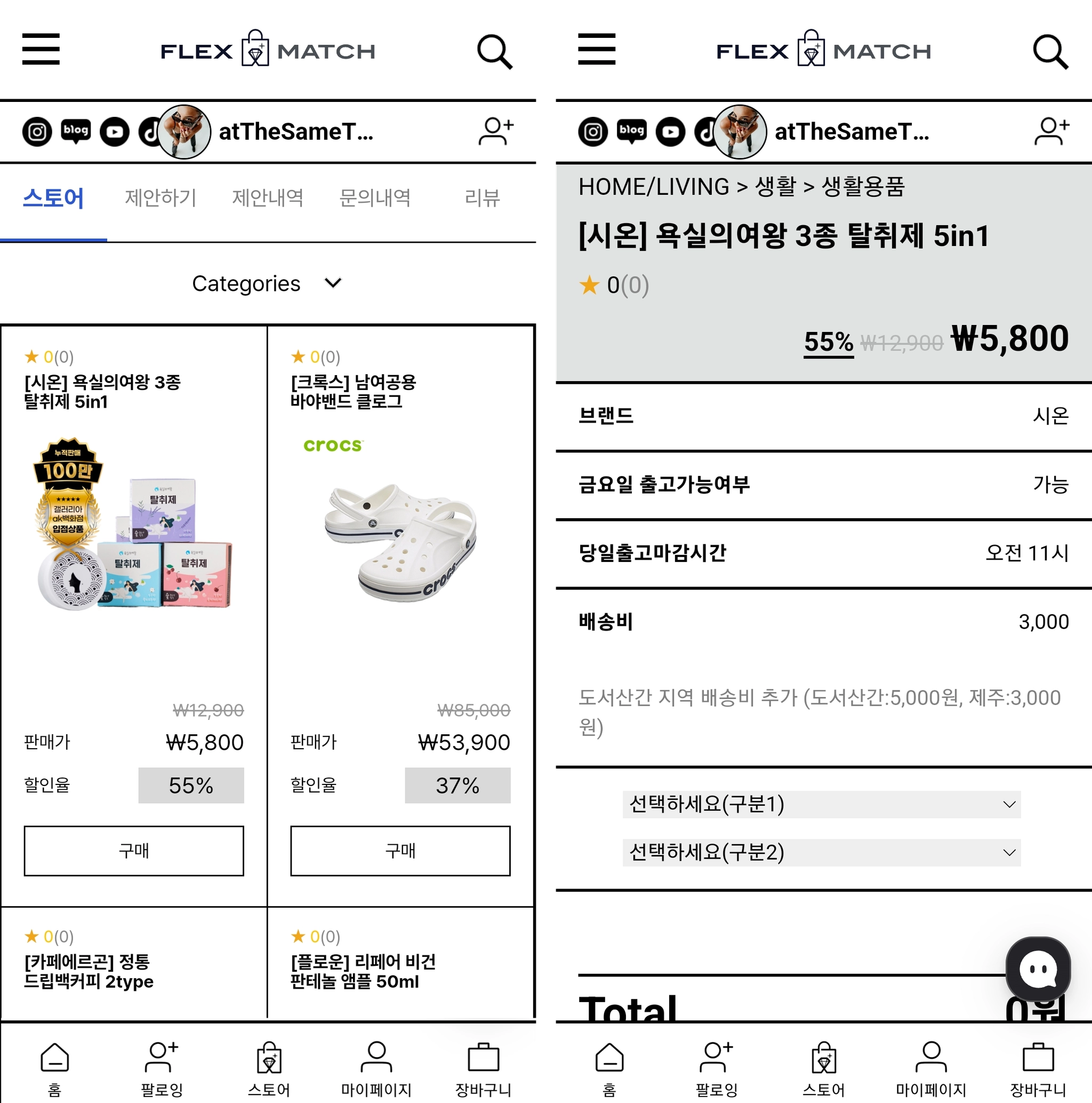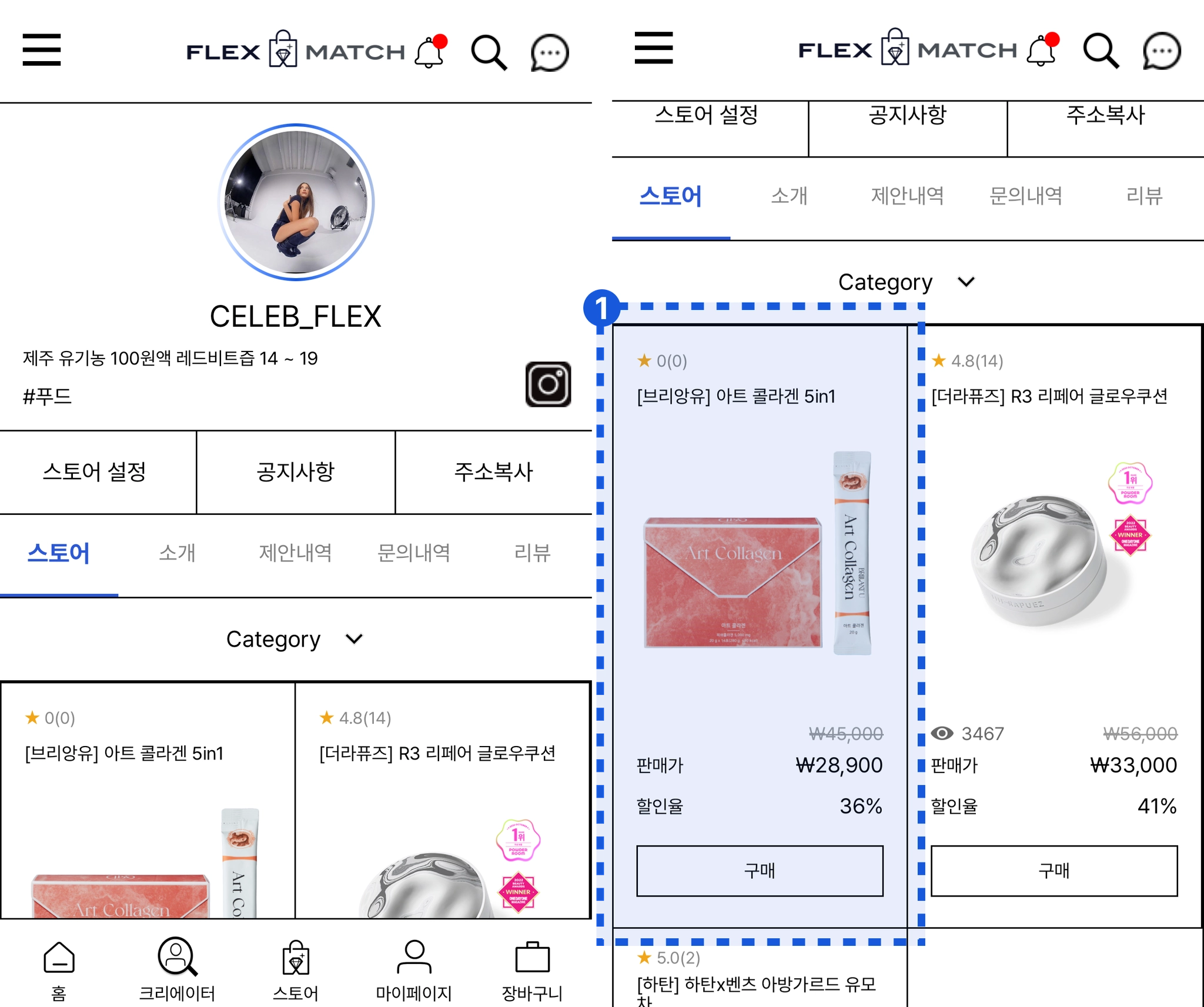 크리에이터 전용 샵인 FLEX MATCH에서 판매를 원하는 상품을 “매칭”하는 기능입니다.