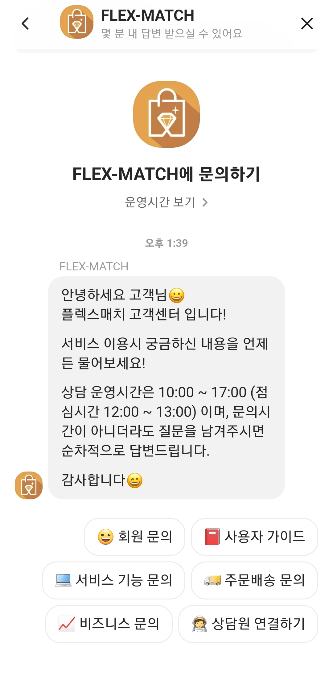 카카오톡 채널 : 플렉스매치 카카오톡 채널로 접속하는 버튼입니다.
