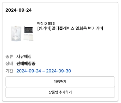 “판매매칭 신청하기” 버튼을 클릭하면 선택한 날짜에 자동으로 상품이 추가 및 삭제됩니다.