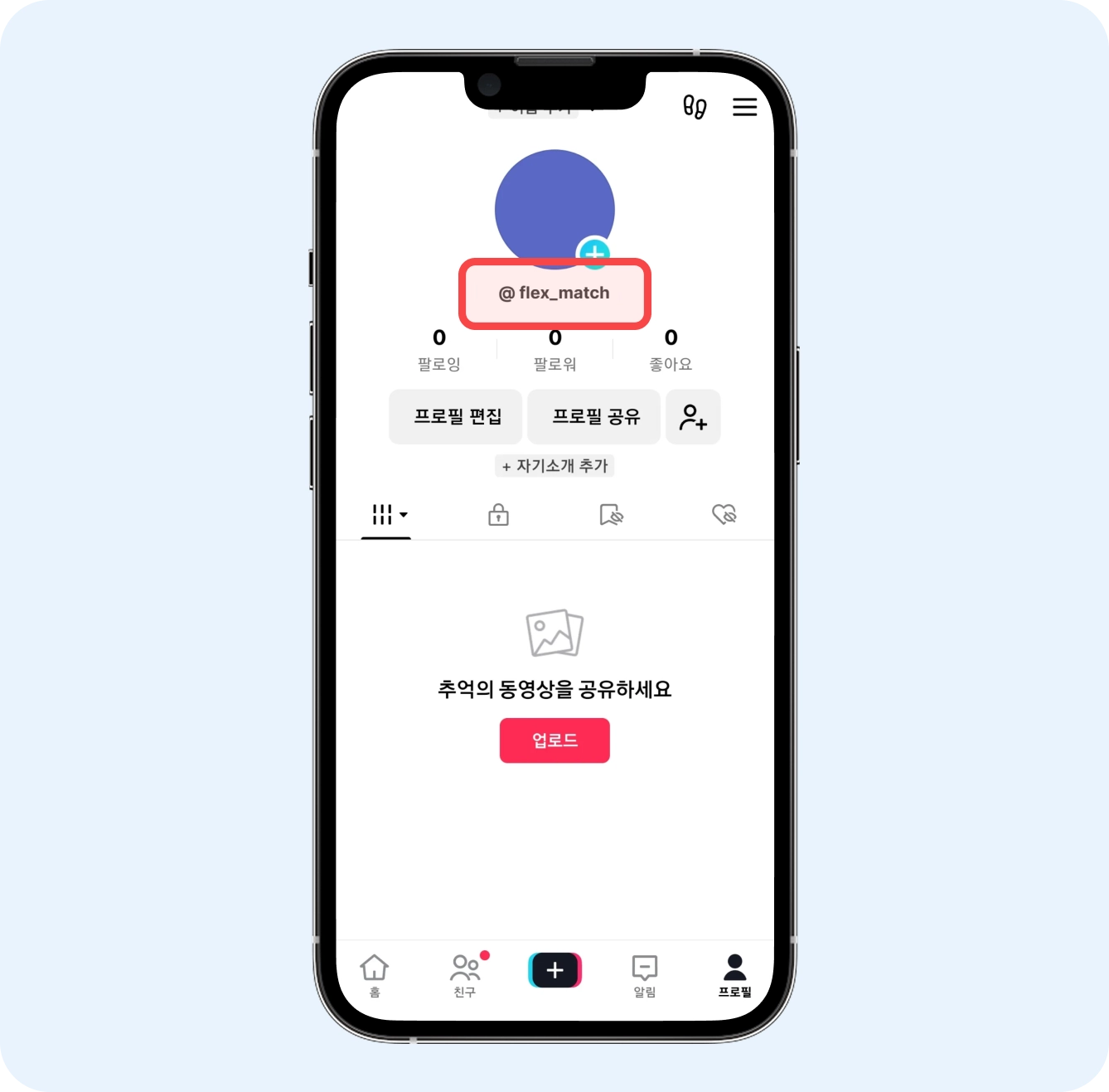 [ 플렉스매치 → 마이페이지 → SNS 추가 ] 로 이동해 틱톡 계정 추가를 진행해 주세요.