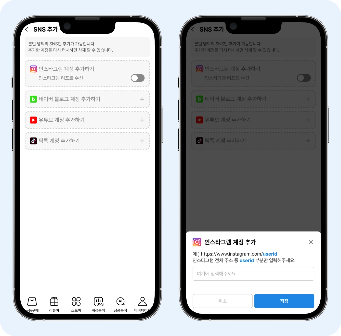 (해당 메뉴를 통해 SNS 추가 화면으로 이동해요.)