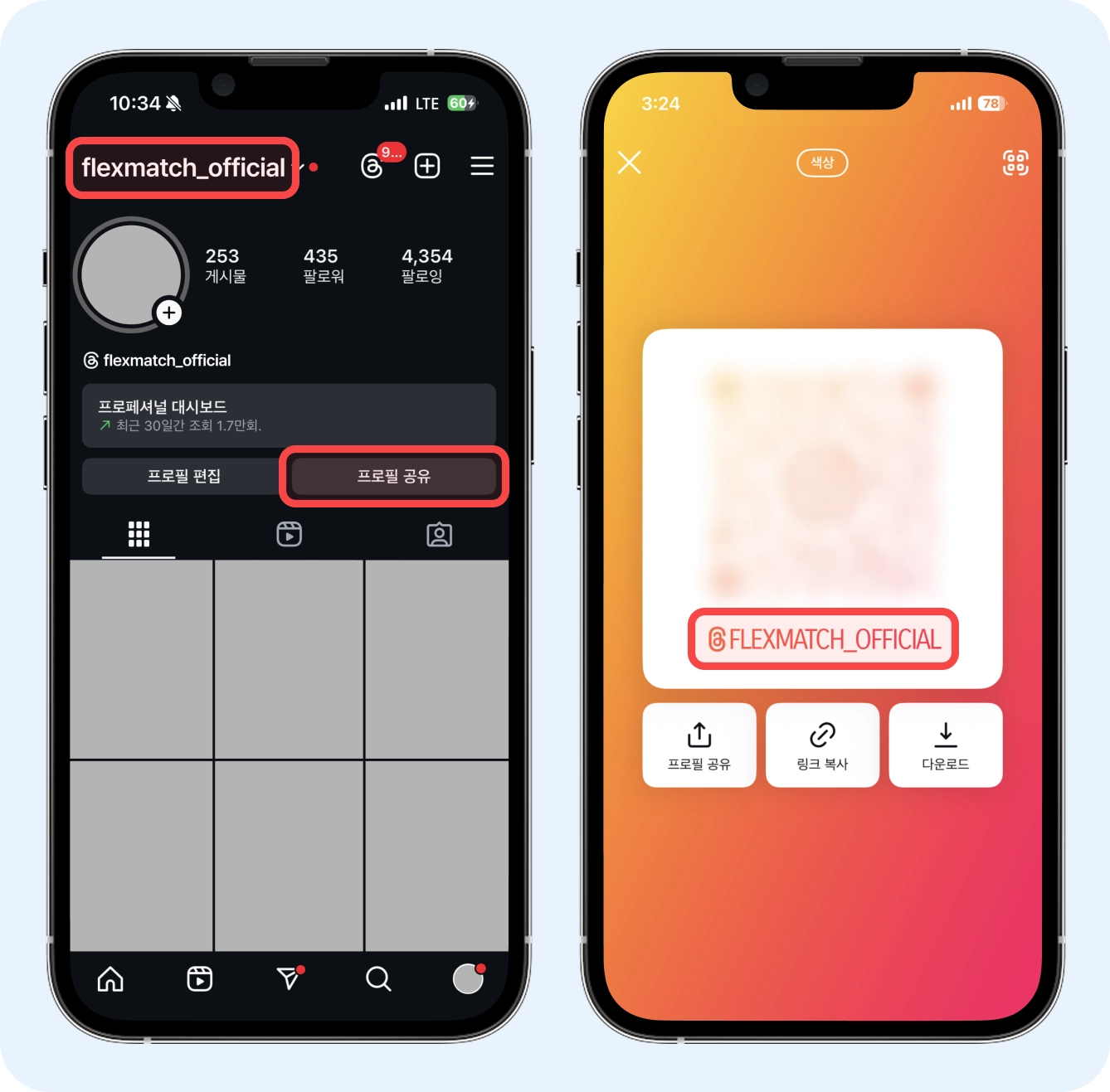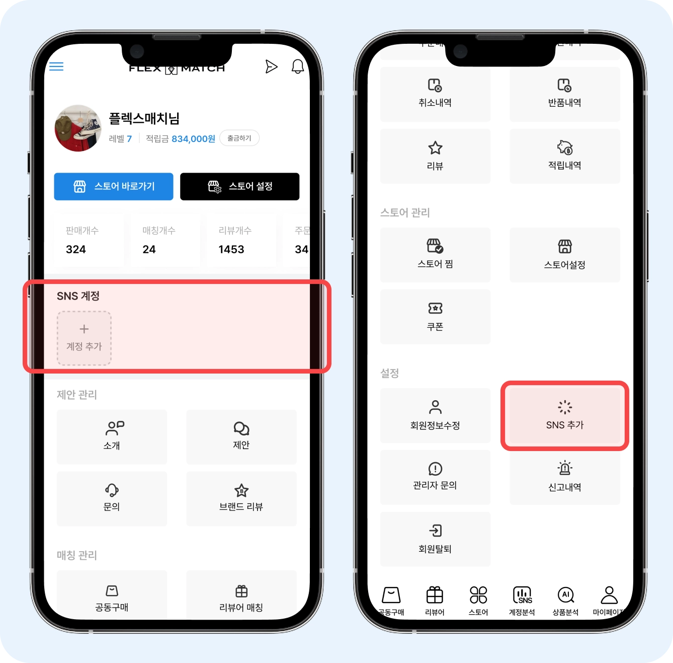 [ 플렉스매치 → 마이페이지 → SNS 추가 ] 로 이동해 인스타그램 계정 추가를 진행해 주세요.
