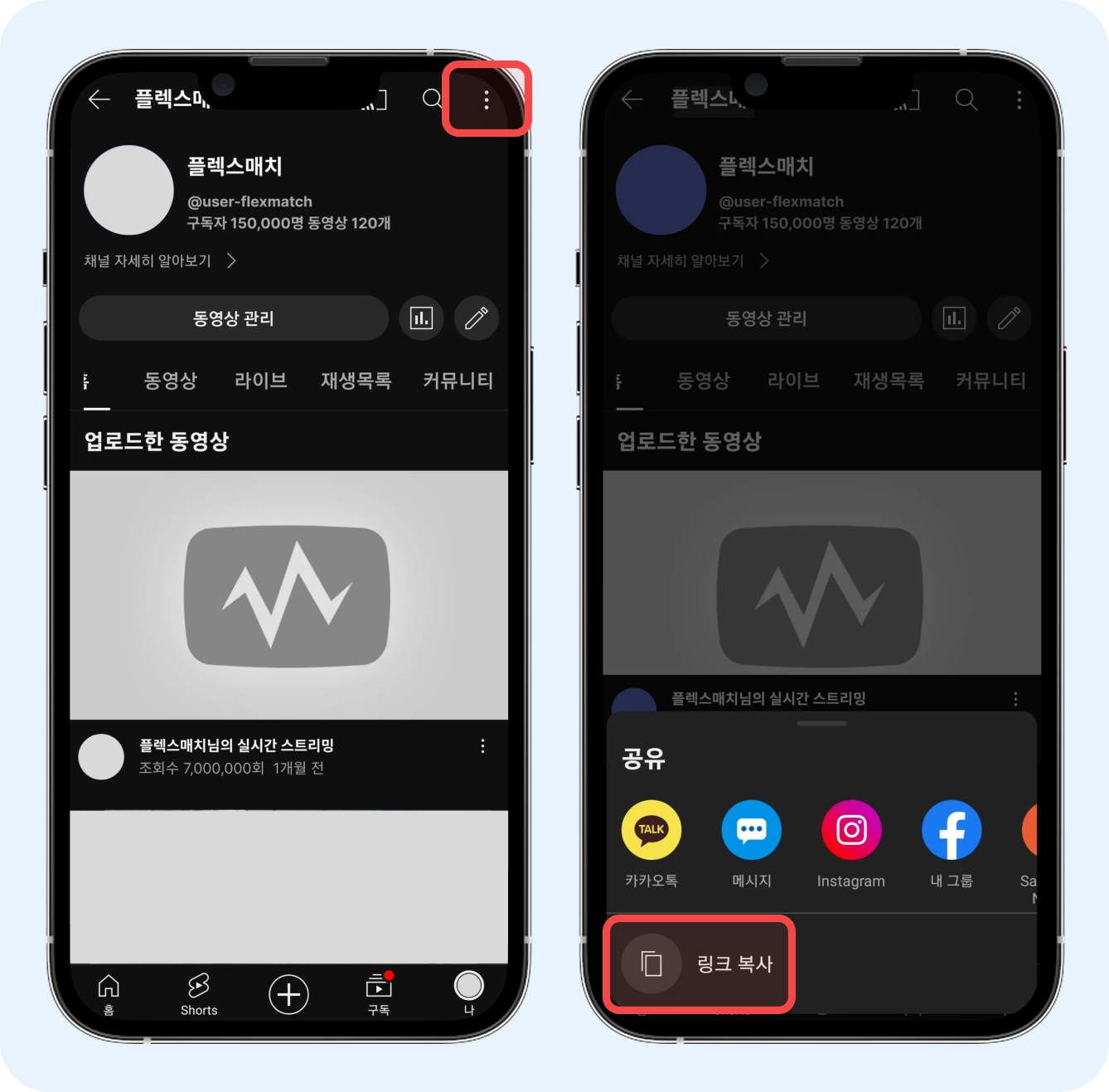 내 유튜브 채널에 접속 후, 우측 상단의 추가 옵션 버튼