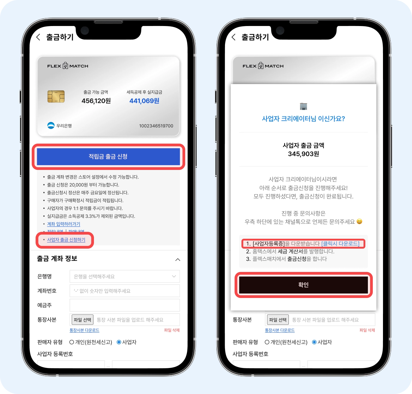 사업자 크리에이터 회원님의 출금신청 방법은 “출금하기 → [사업자 출금 신청하기]” 에서도 확인 가능해요.