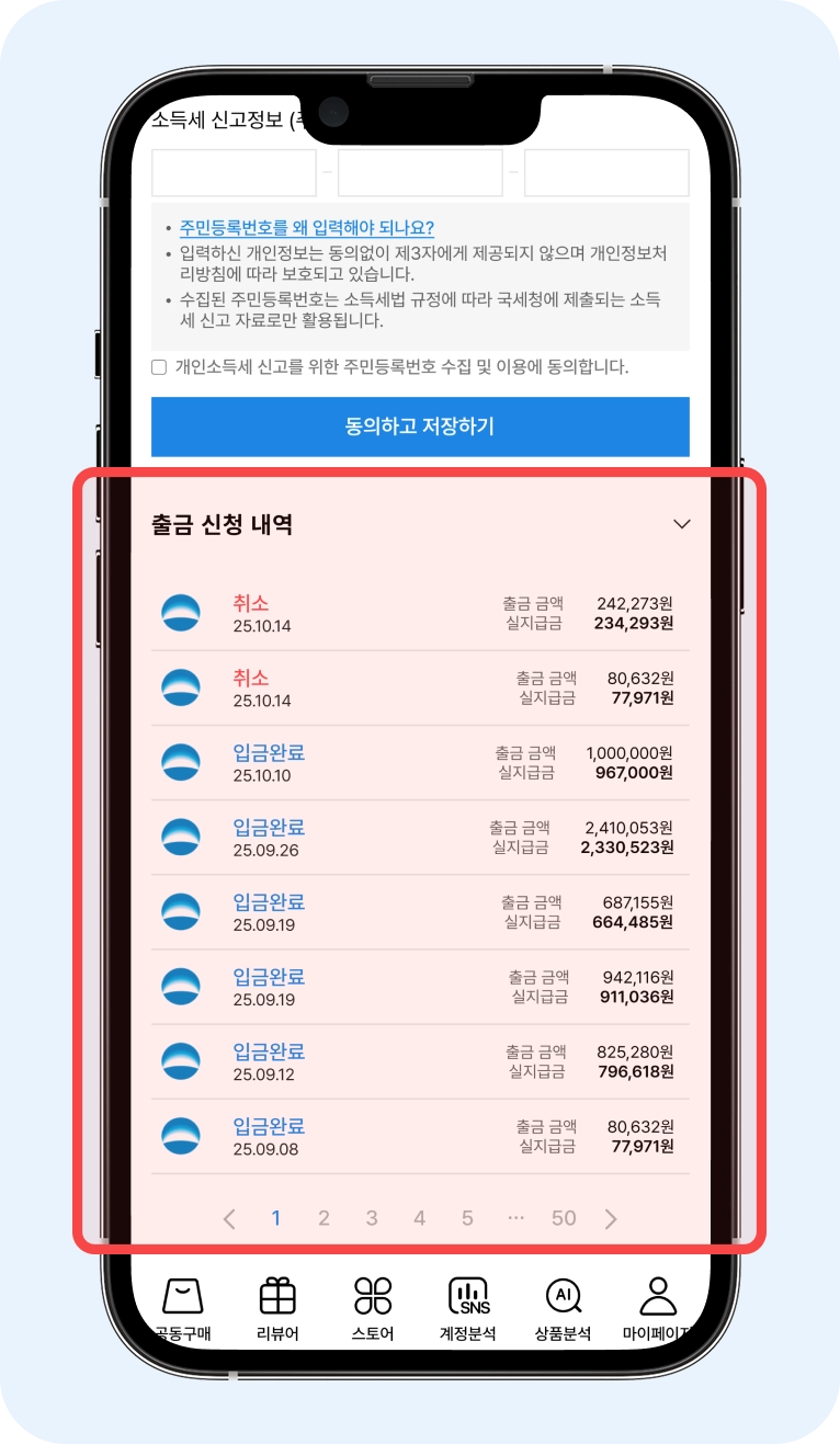 세금계산서 발행 후 [마이페이지 → 출금하기]에서 [적립금 출금 신청]을 터치