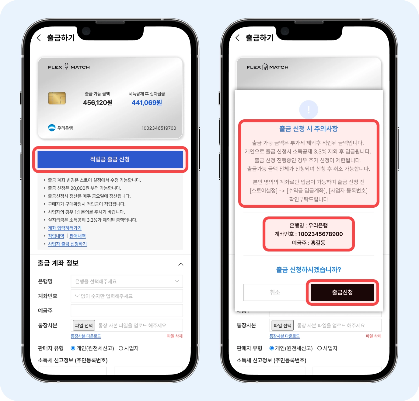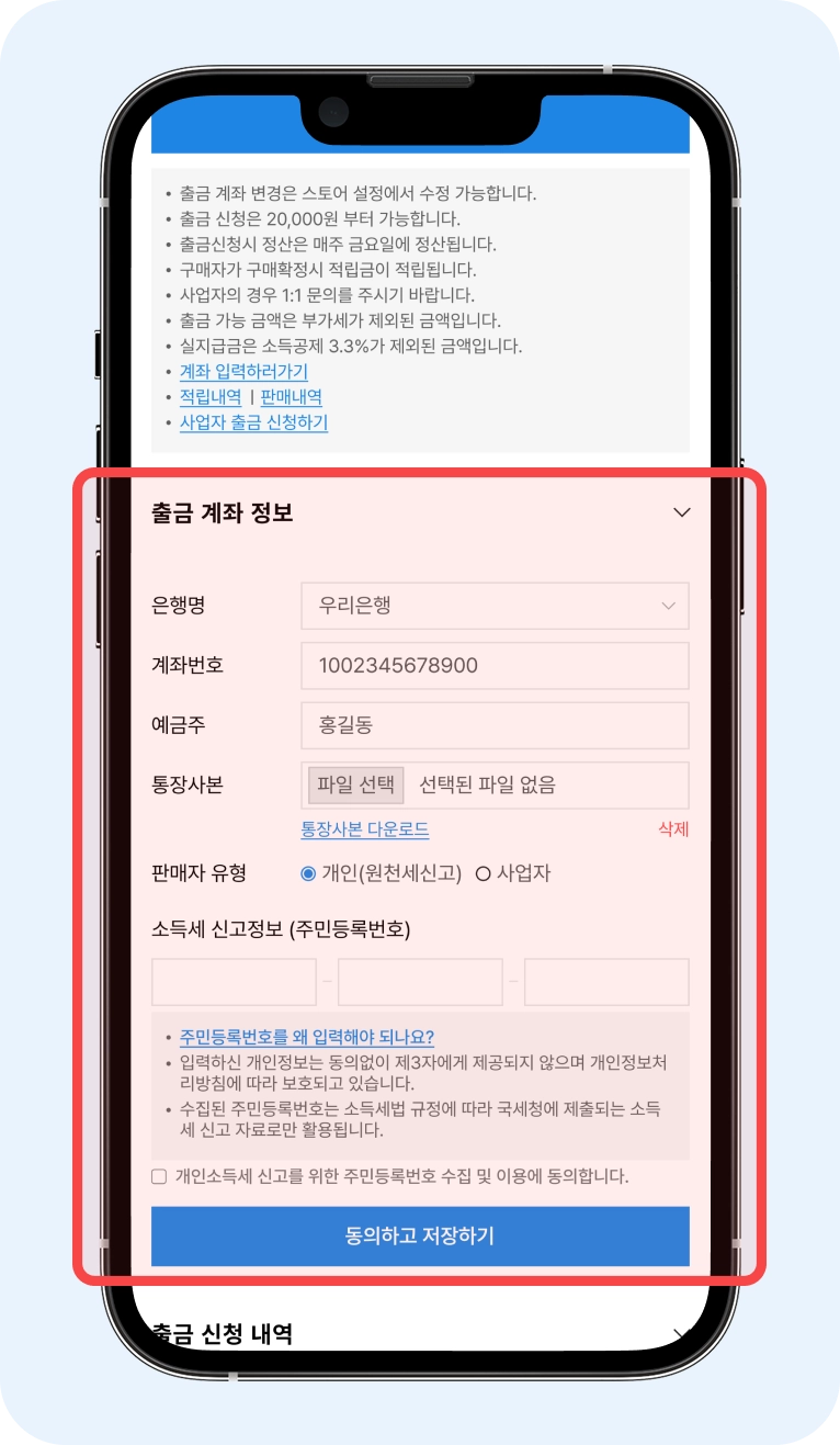 출금 신청 전, 계좌 정보가 맞는지 꼭 확인해 주셔야 해요.