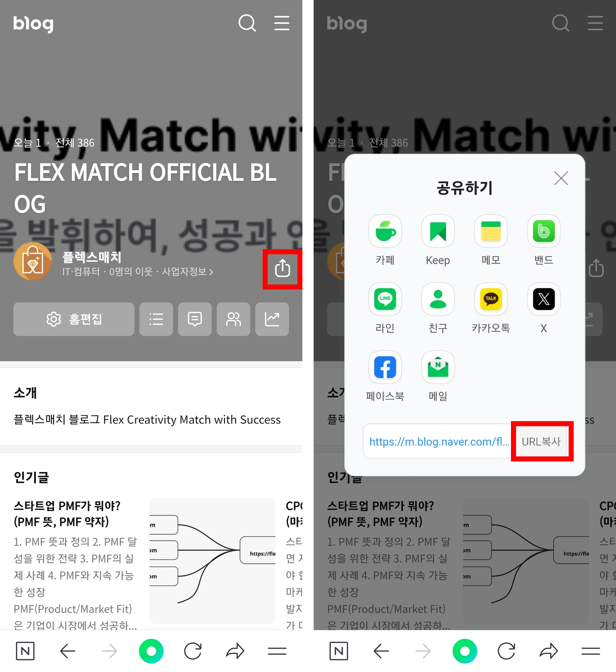 공유하기 팝업에서 하단에 있는 “URL 복사”를 클릭합니다.