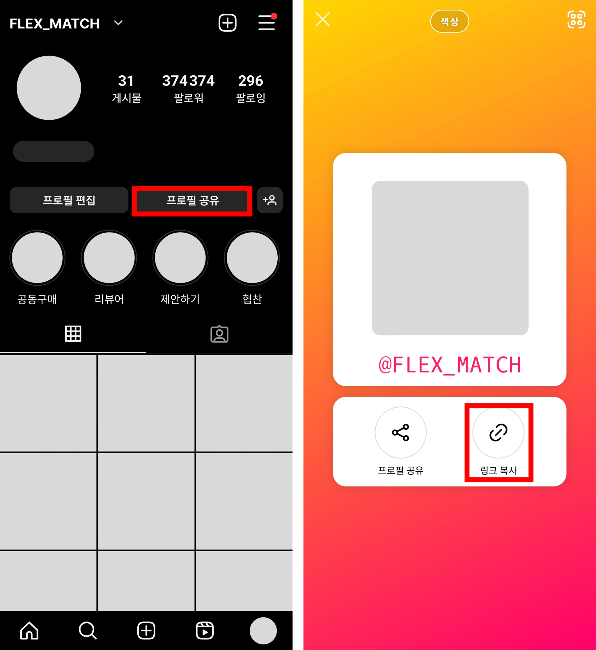 “프로필 공유”를 클릭하고, 공유 QR 화면에서 “링크 복사”를 클릭합니다.