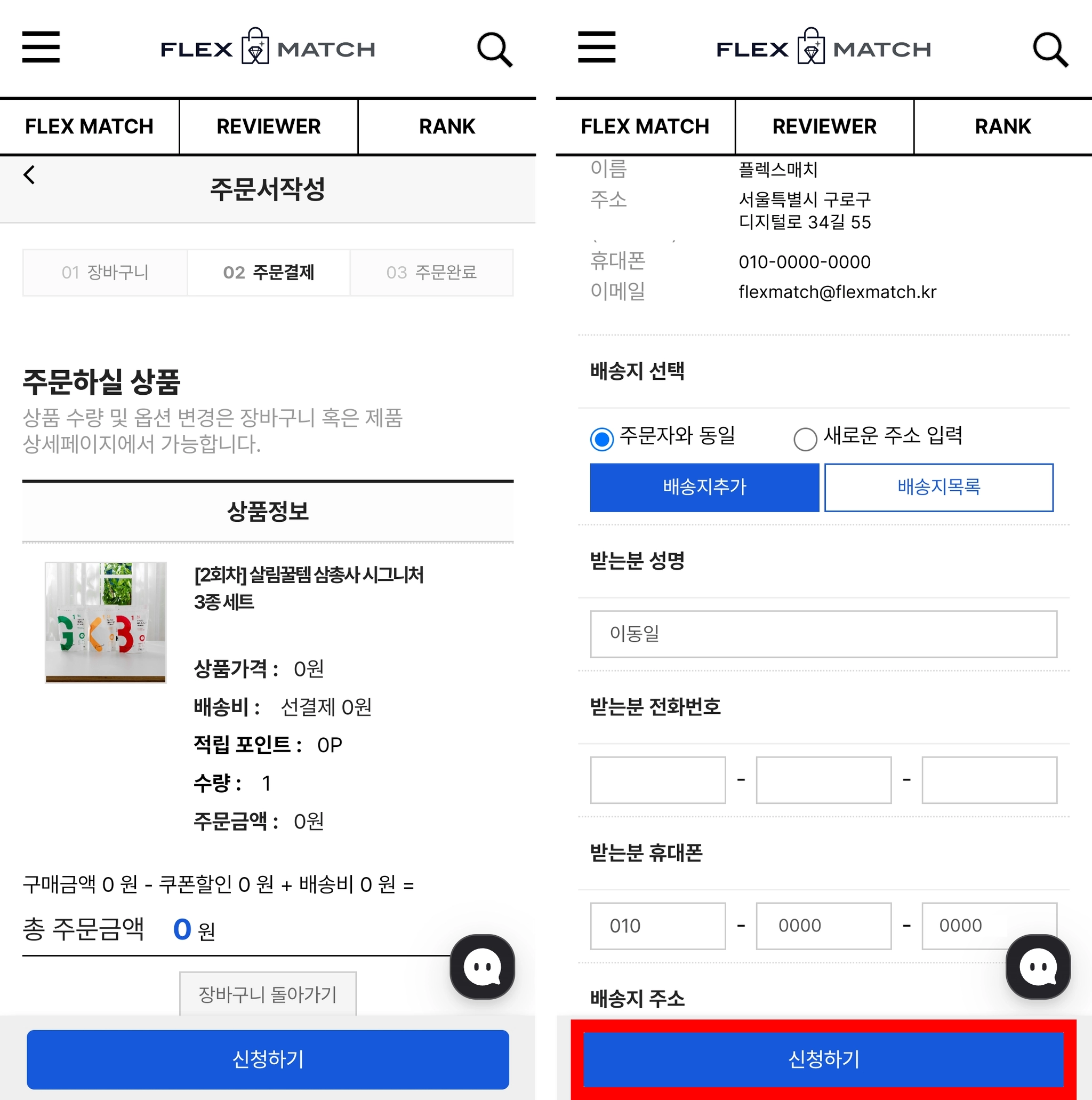 상품을 배송받을 주소를 입력하고 “신청하기”를 클릭합니다.