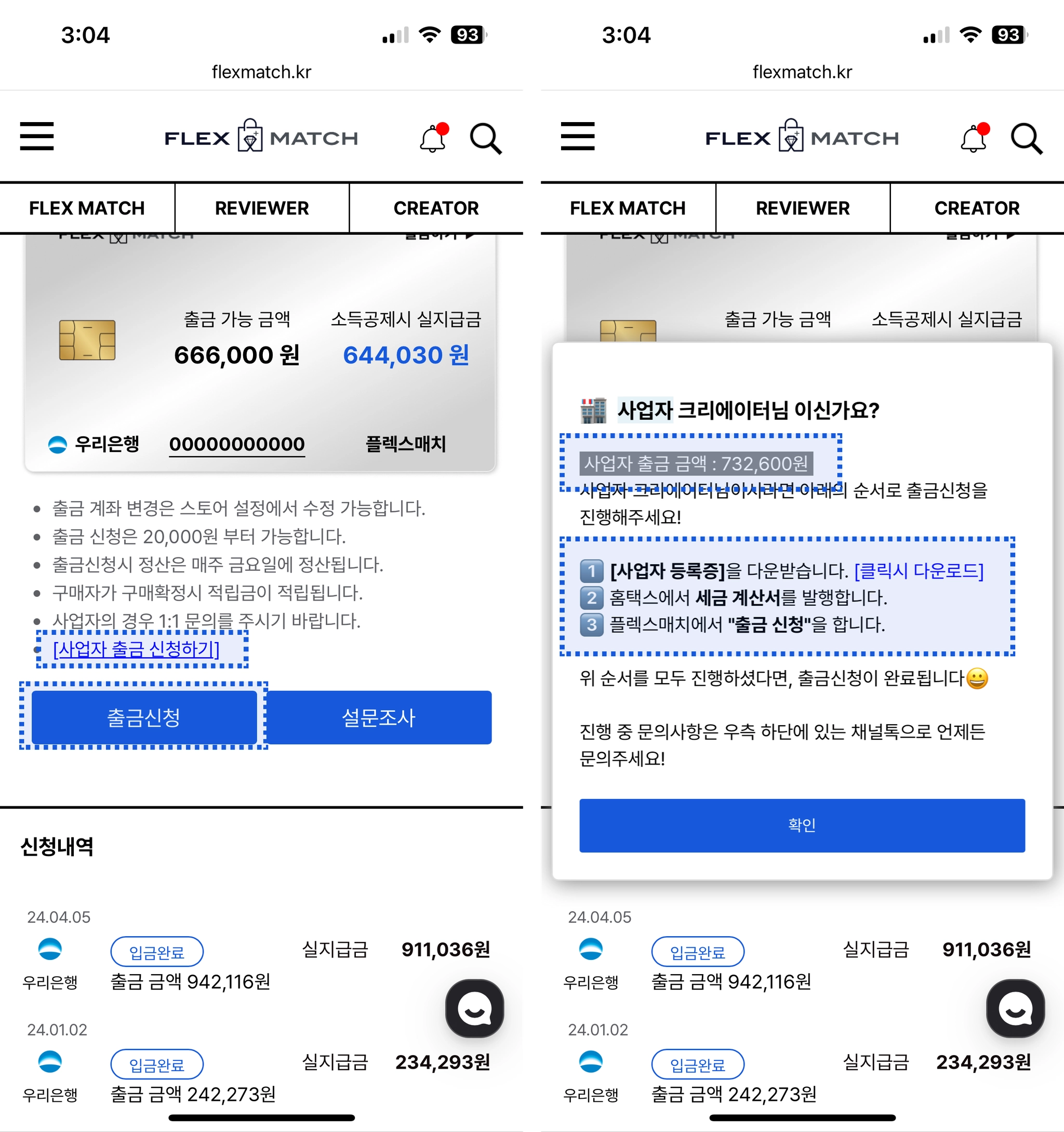 이후 플렉스매치의 정산담당자가 입력하신 계좌로 돈을 입금 및 소득세 신고가 진행합니다.