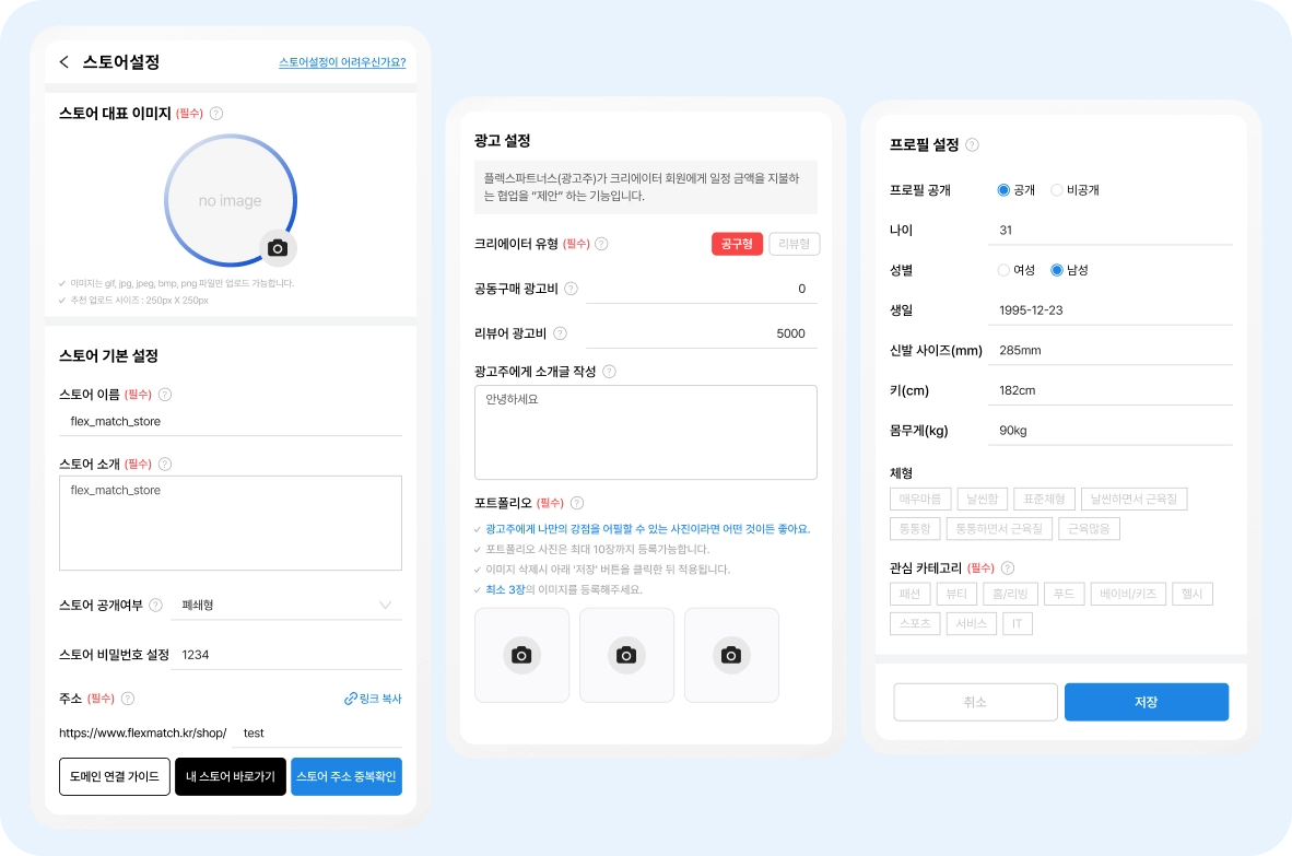 스토어 대표 이미지, 스토어 이름과 소개, 3장 이상의 포트폴리오 이미지는 선택매칭 선정률을 높이는데 큰 도움이 되는 항목이에요. 크리에이터님을 잘 나타낼 수 있는 정보들로 채워보세요!