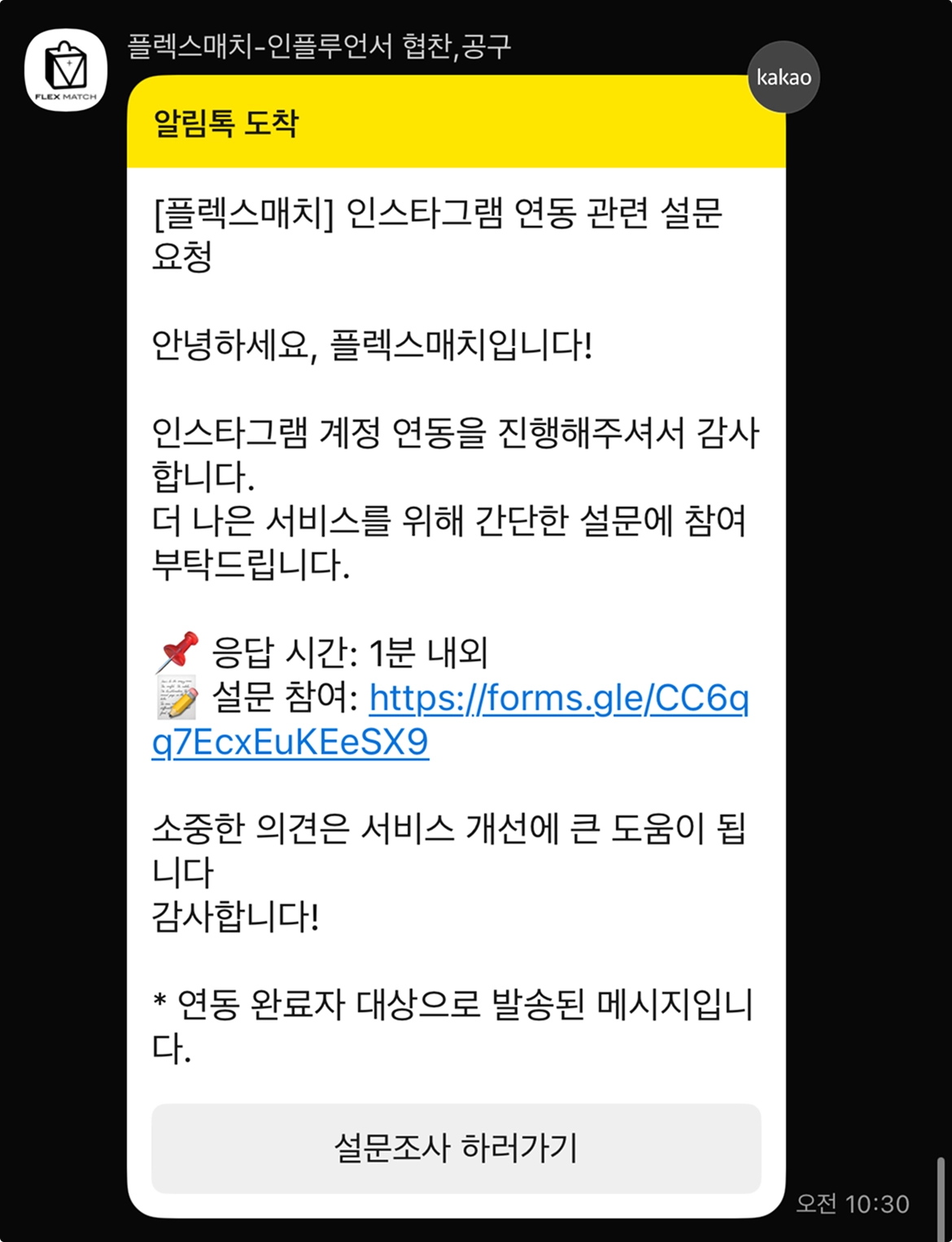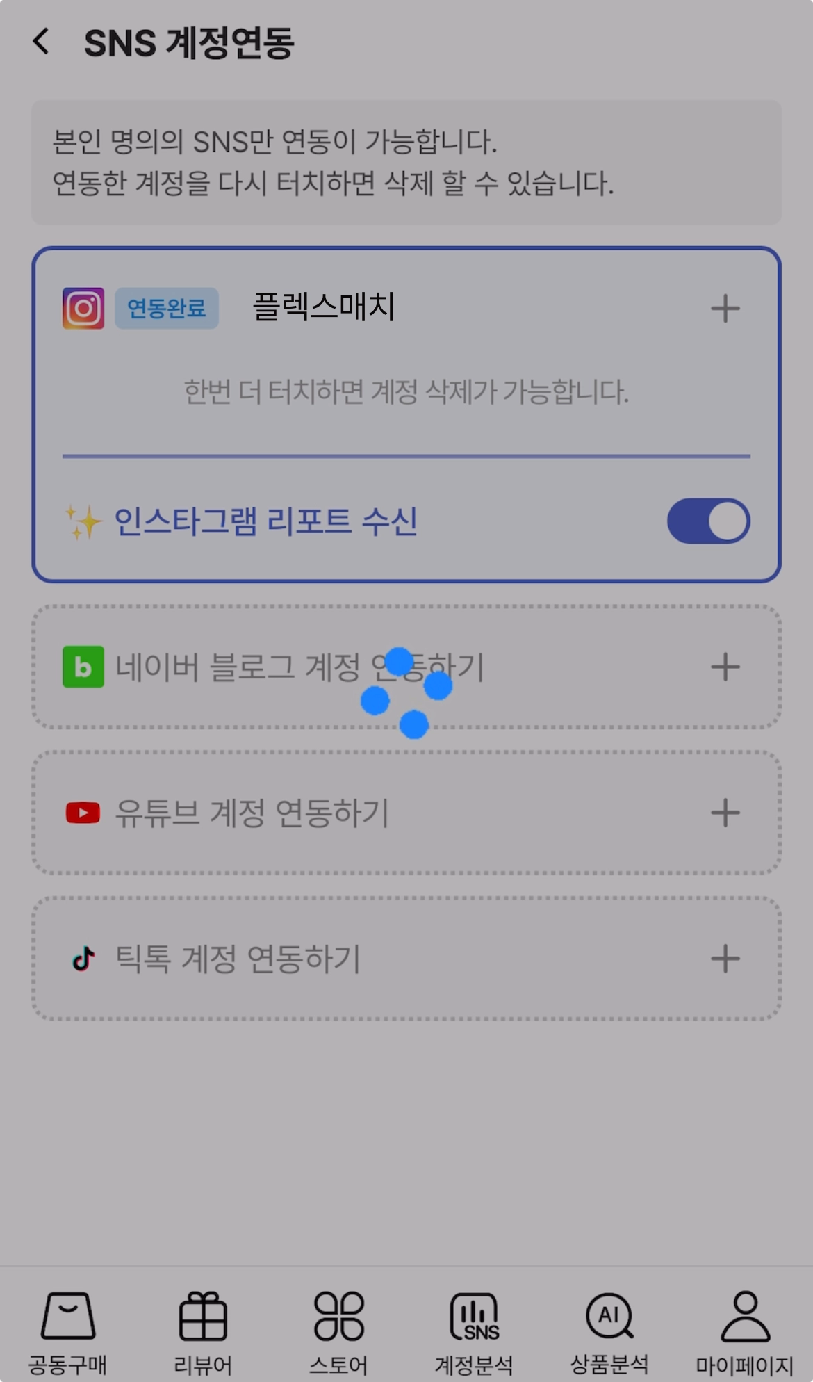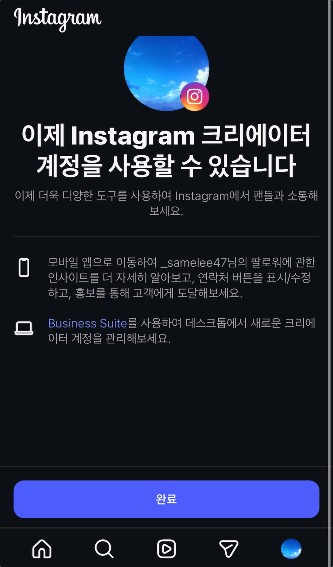 로딩 후 “인스타그램 계정 연동이 완료되었습니다” 안내가 나오면 연동이 마무리 됩니다.