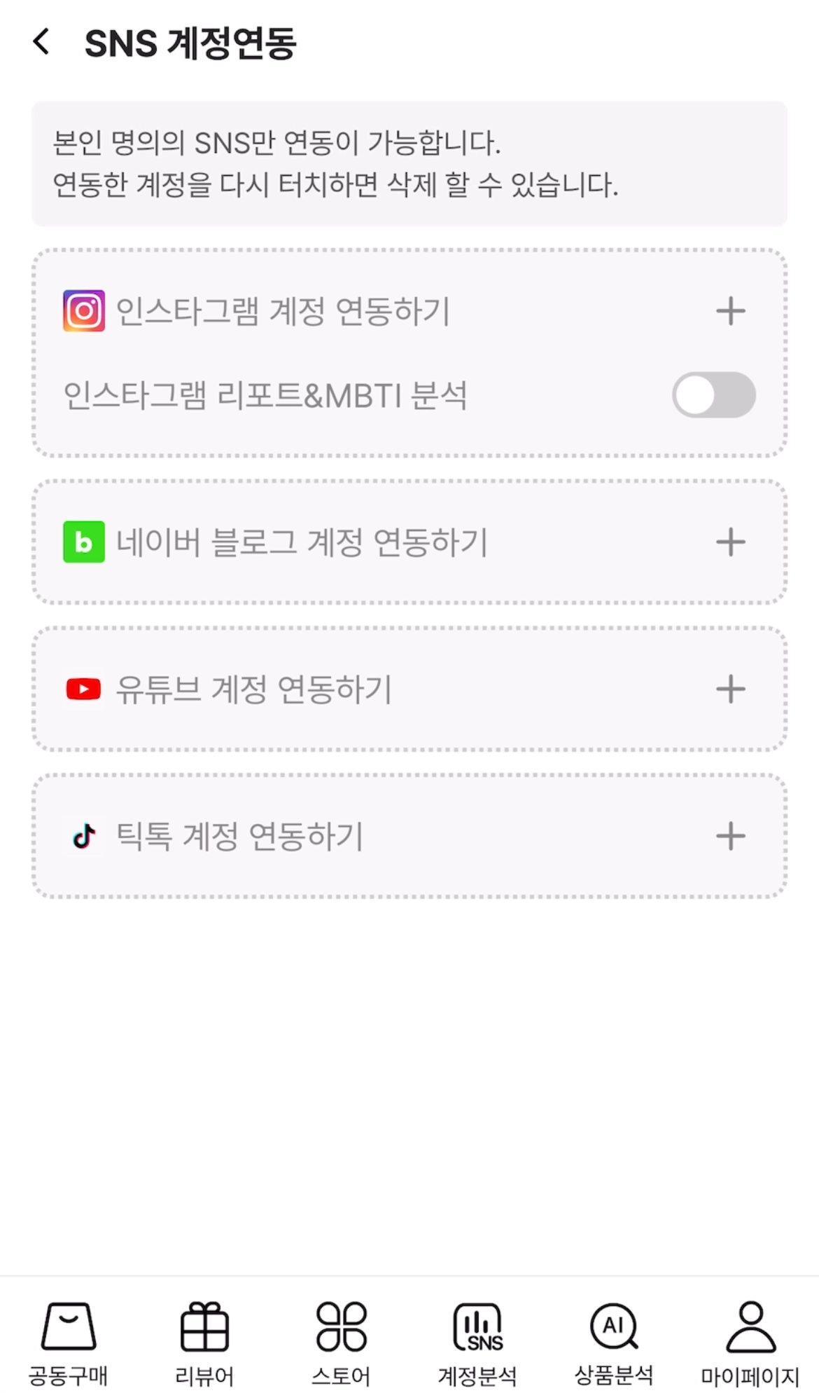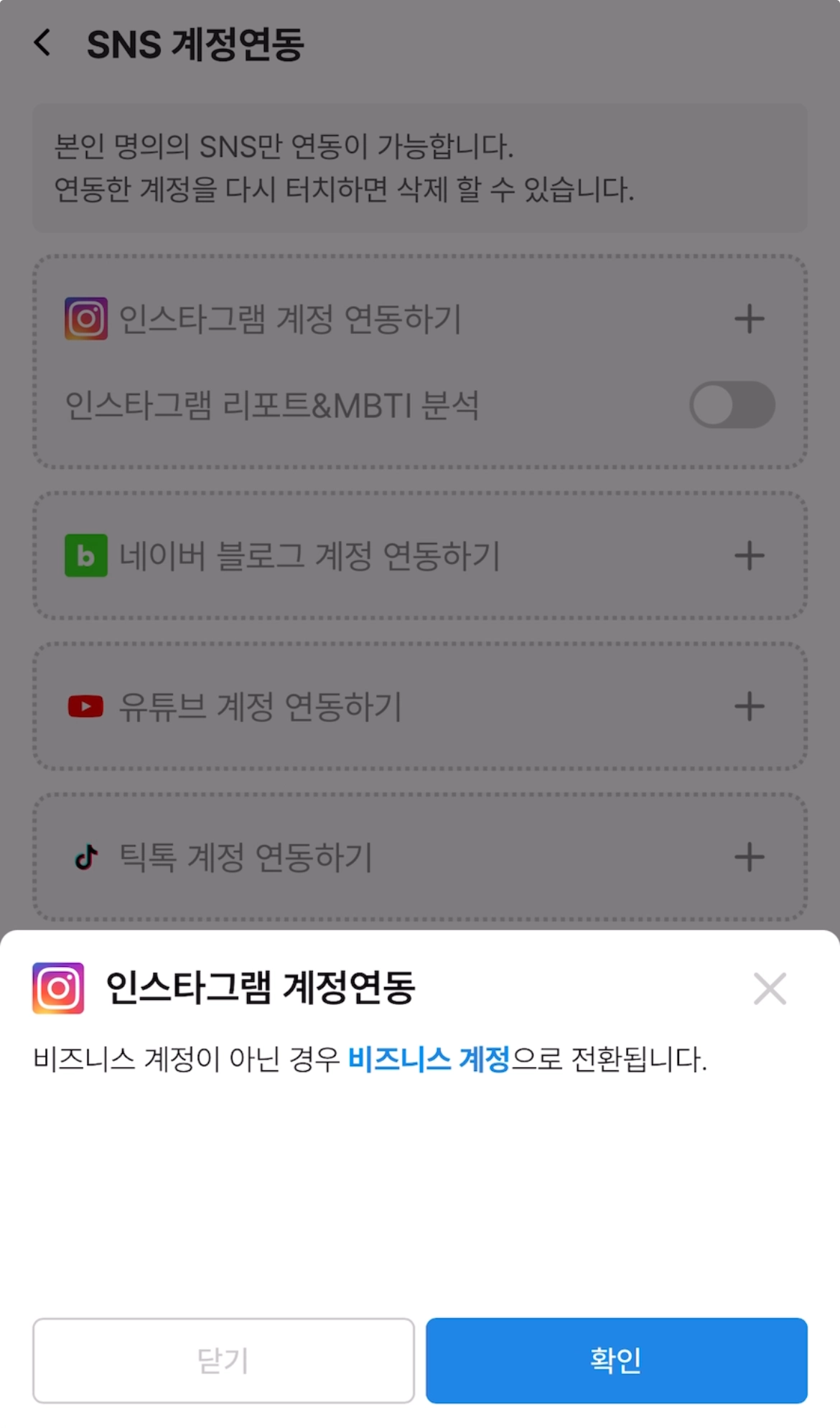 중앙에 있는 [SNS 계정연동] 부분에서 인스타그램 아이콘(리포트&MBTI 받기)을 클릭하여 계정연동 페이지로 이동합니다.