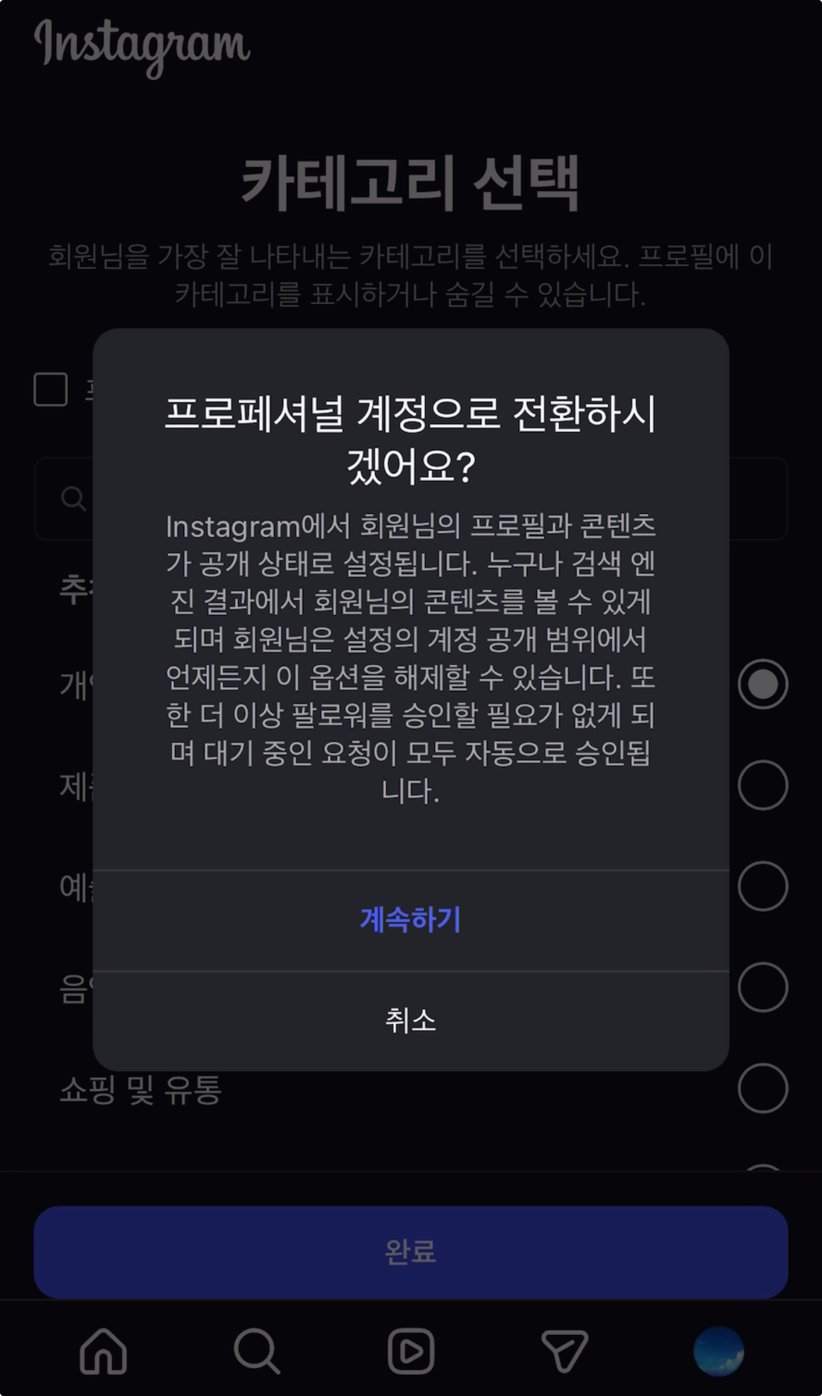 프로페셔널 계정 전환 확인 팝업에서 [계속하기]를 클릭합니다.