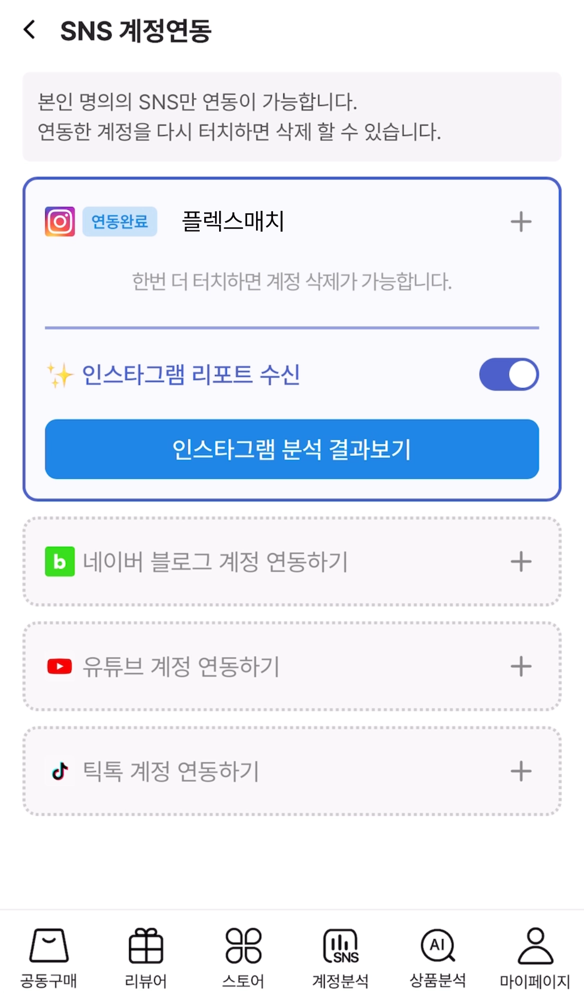 SNS 계정연동 페이지에서 [인스타그램 계정 연동하기]를 클릭합니다.