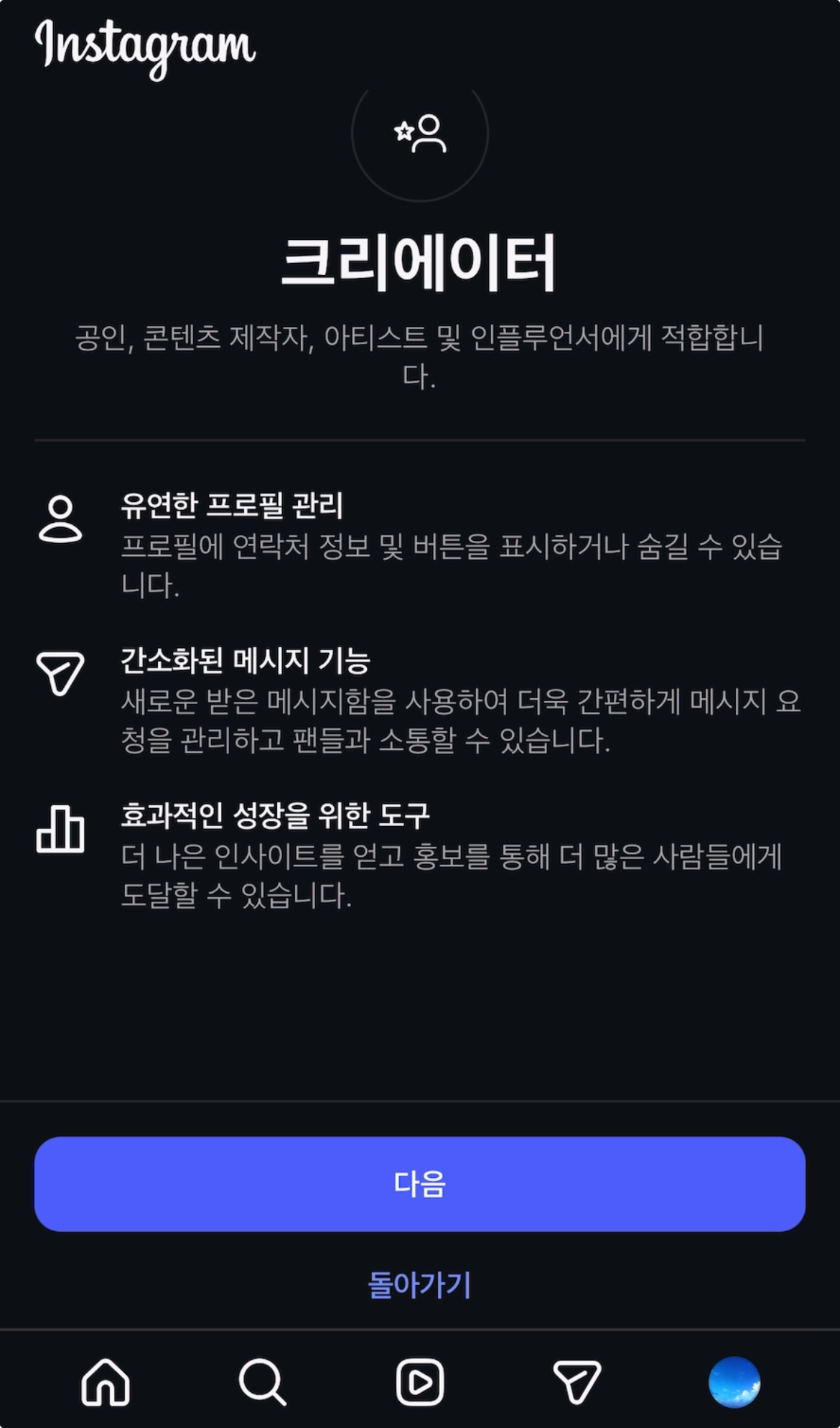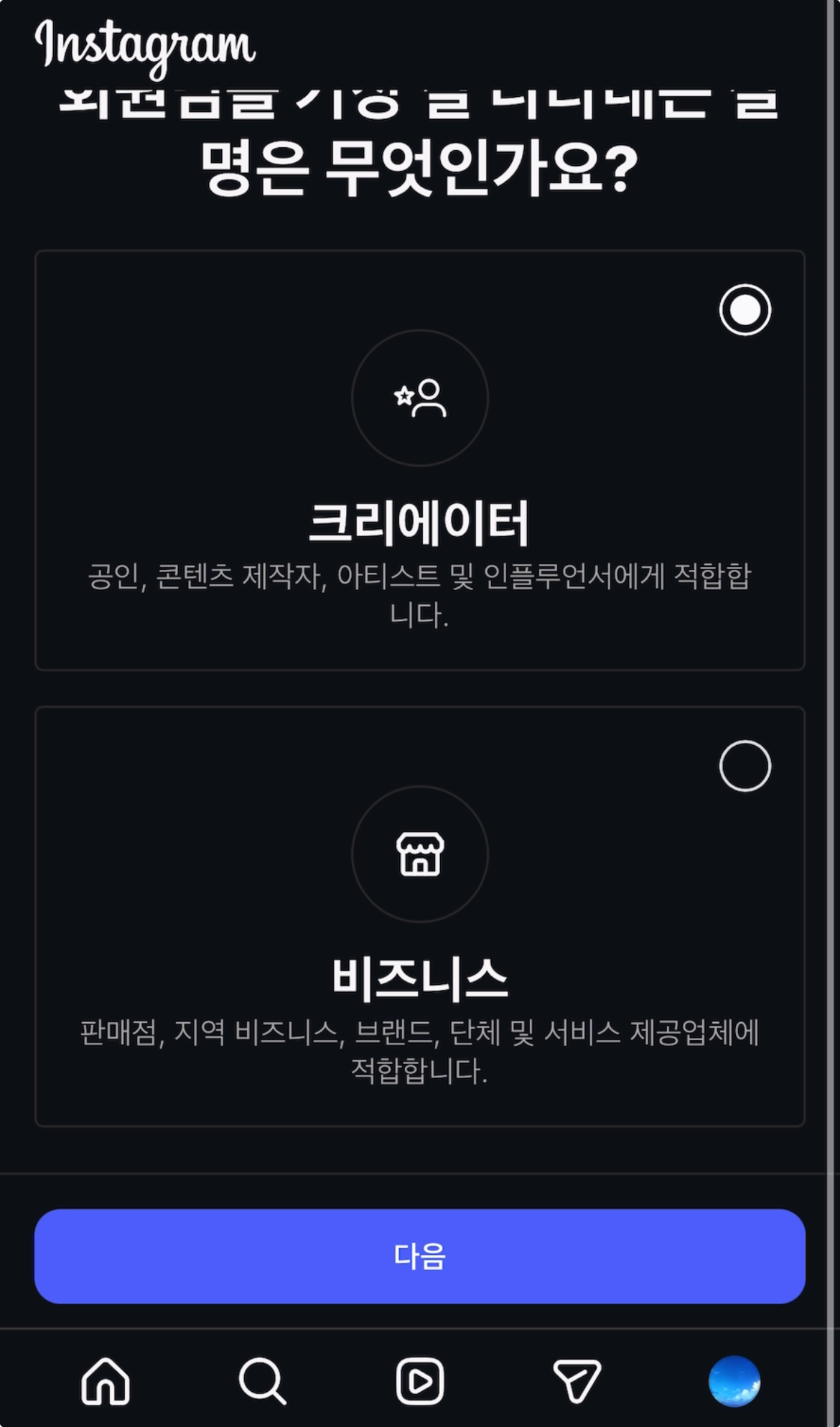 크리에이터 또는 비즈니스를 선택 후 [다음]을 클릭합니다.