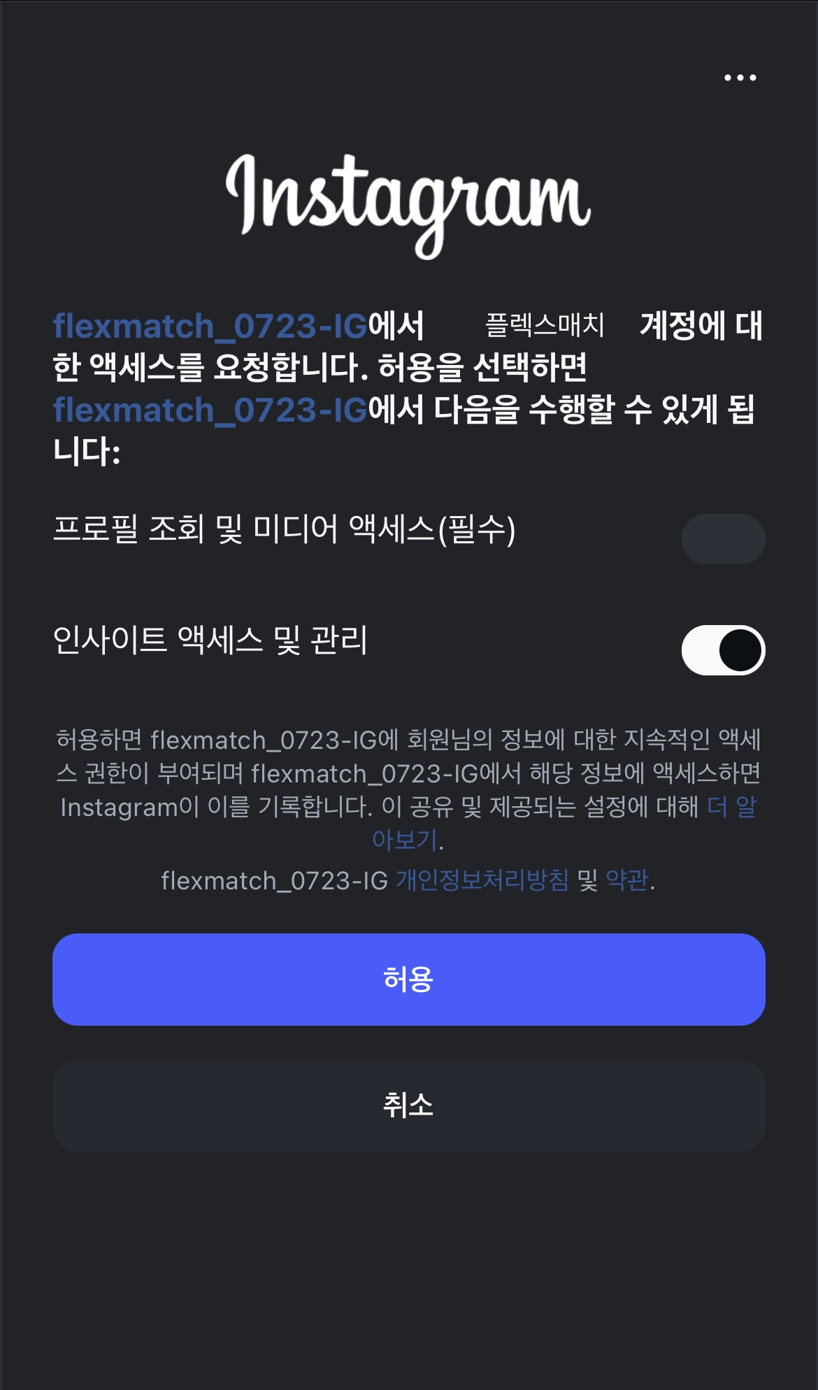 이후 플렉스매치와 연결하는 팝업에서 2가지 항목을 허용으로 변경 후 [허용] 버튼을 클릭합니다.