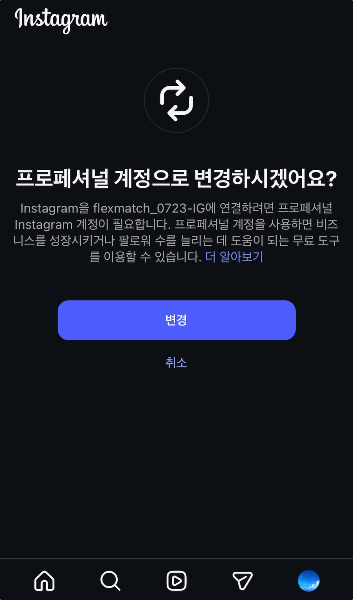 인스타그램 로그인 후 프로페셔널 계정 변경 화면에서 [변경]을 클릭합니다.