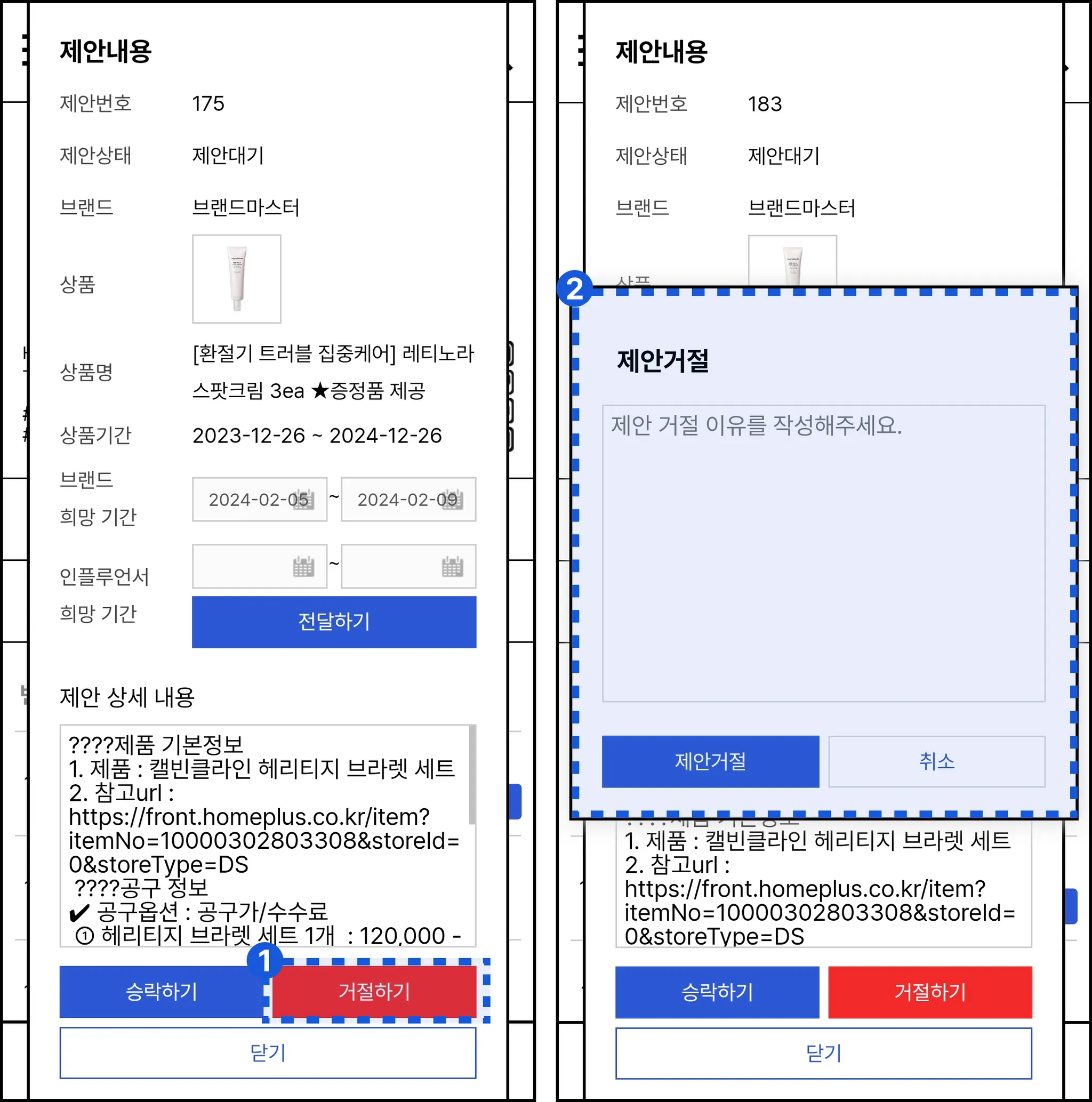 아래 목록 중 “제안대기” 상태인 항목 중에서 “제안내용” 버튼을 클릭하면 구체적인 제안내용을 확인할 수 있습니다.