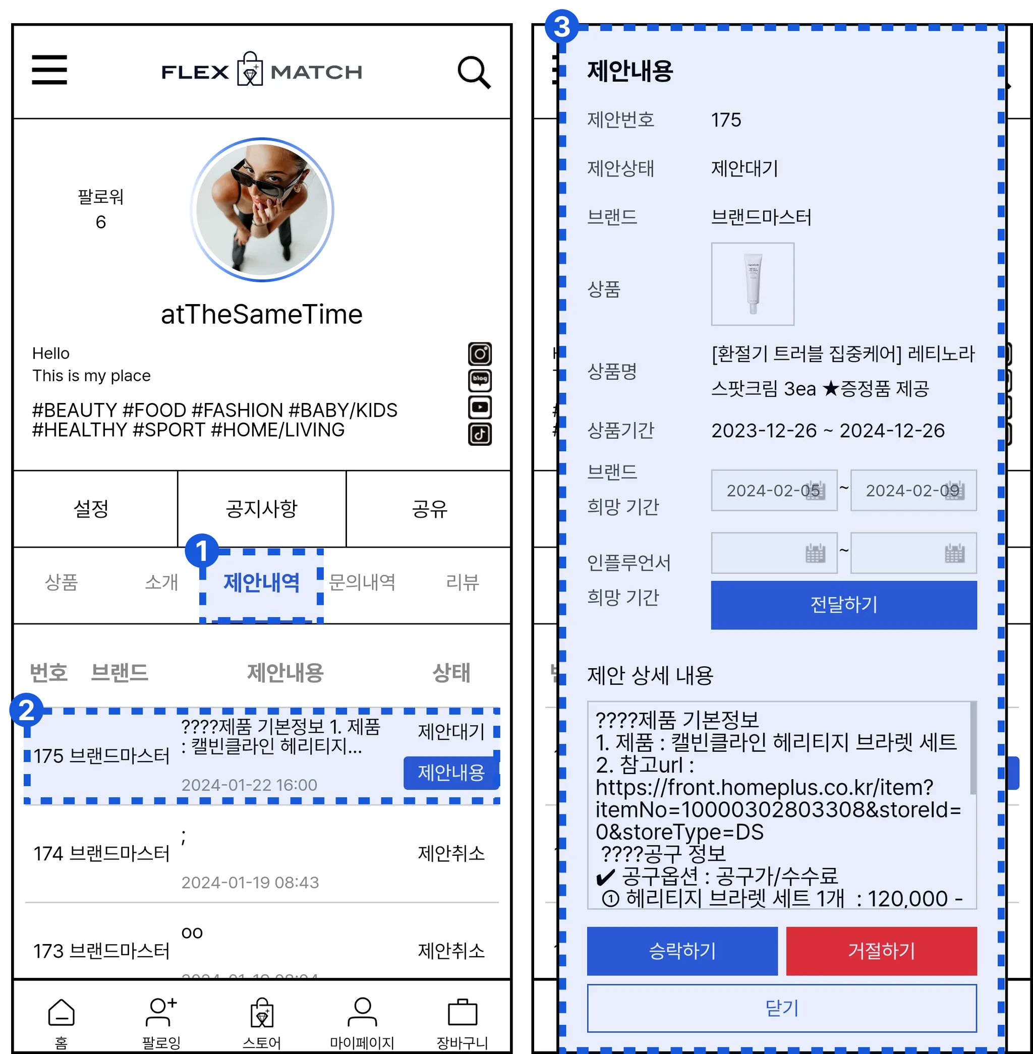 제안하기란? 플렉스 파트너스(광고주)가 크리에이터 회원에게 일정금액을 지불하고 공동구매를 “제안”하는 기능입니다.