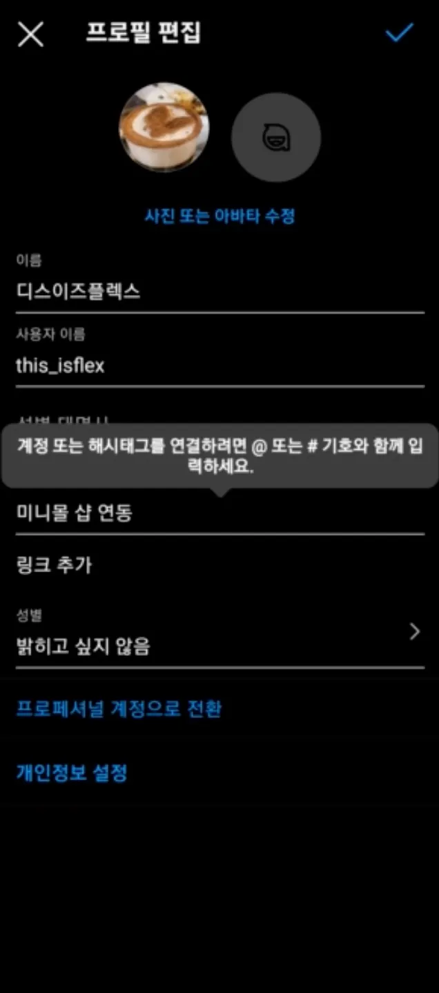 인스타그램 프로필 편집에서 계정을 비즈니스 계정(프로페셔녈 계정)으로 전환